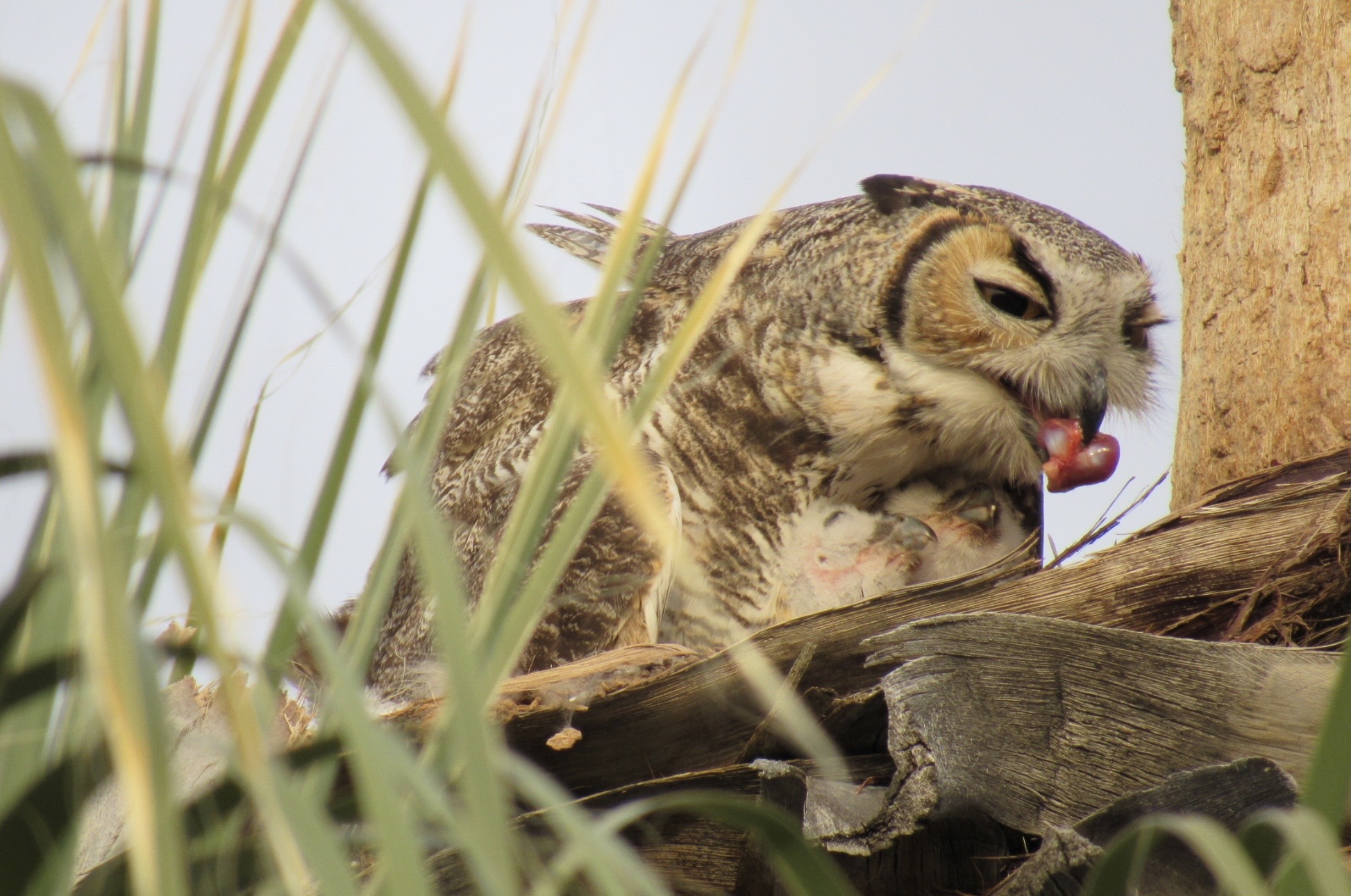 Mama Great Horned Owl feeds two of her three owlets before their eyes were open. They nested half way up a palm tree.