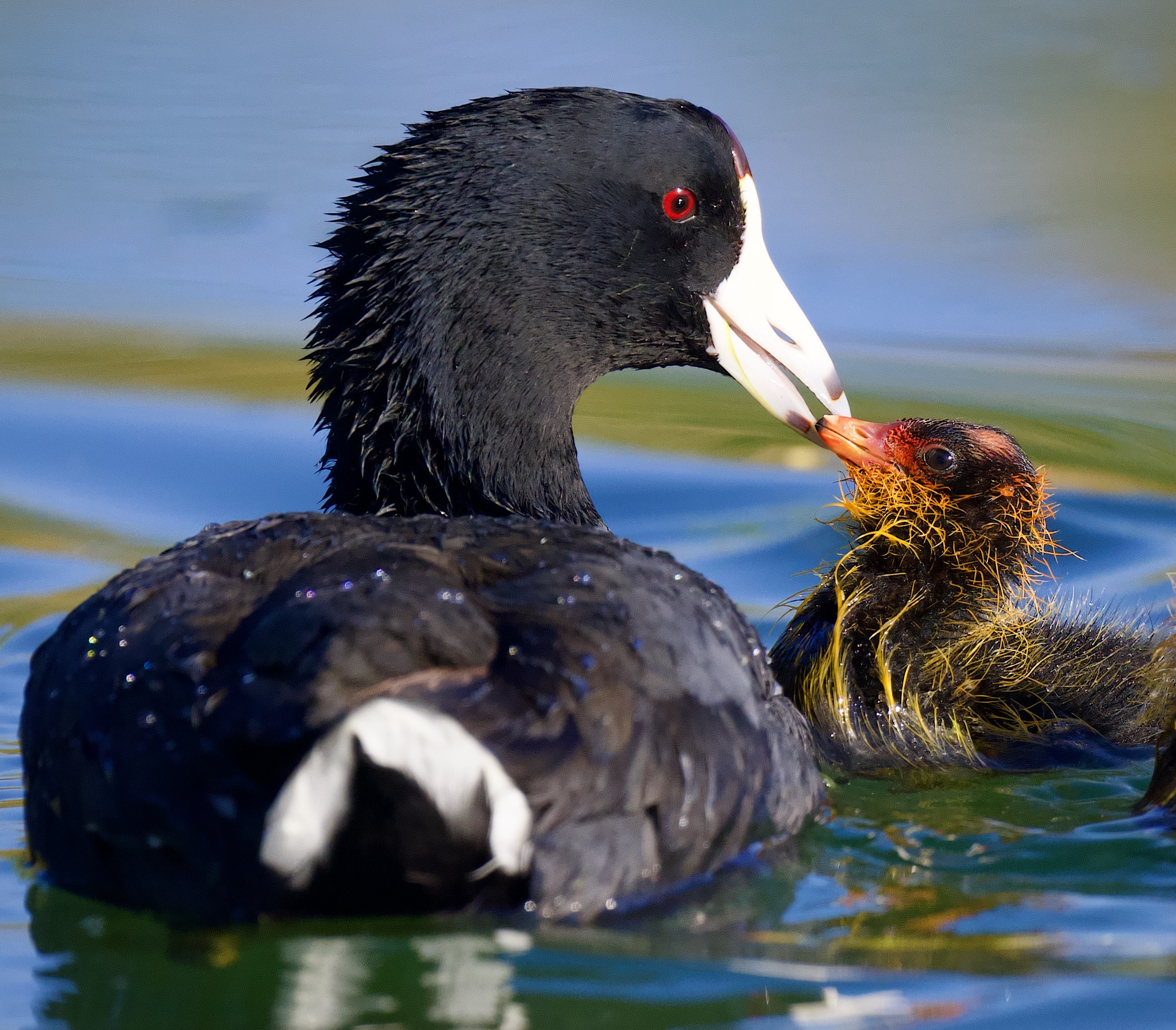 An American Coot "Momma" and one of her babies share a tender moment !