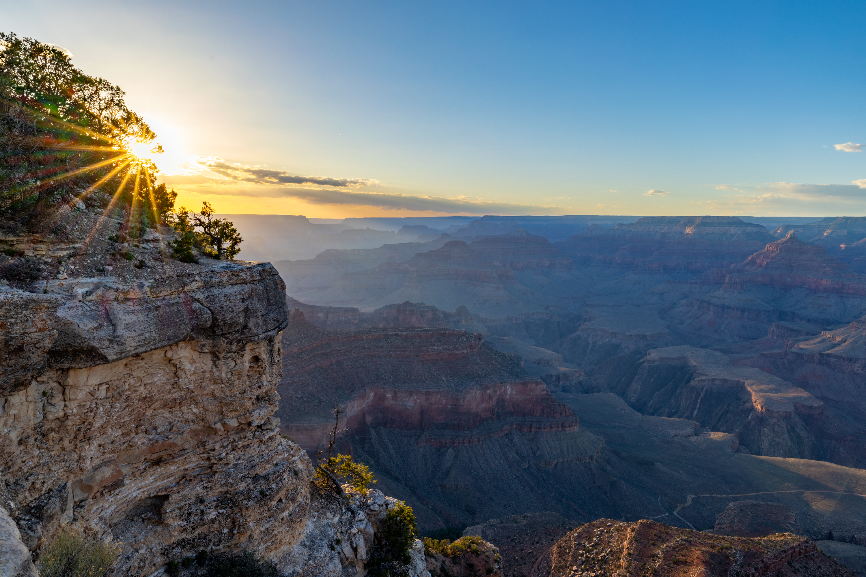 The sun creates a brilliant starburst casting rays of light into the depths of the Grand Canyon, creating a breathtaking dance of shadow and color at sunset.