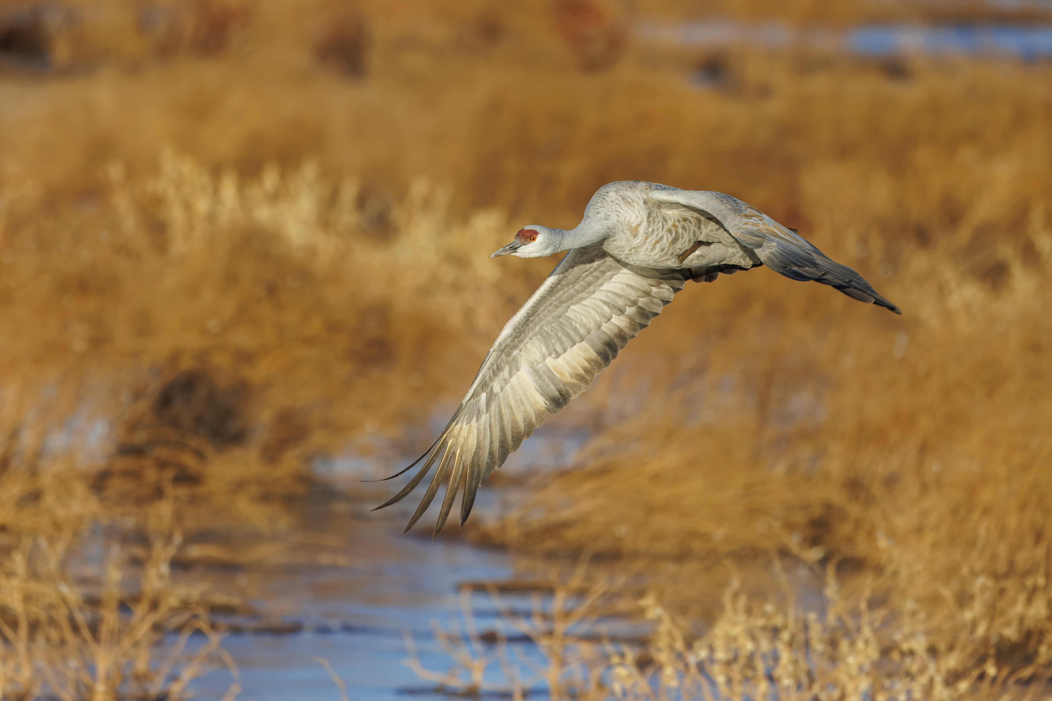 Bathed in the soft glow of morning light, a Sandhill Crane takes flight—its powerful wings carrying the promise of a new day across the Arizona sky.