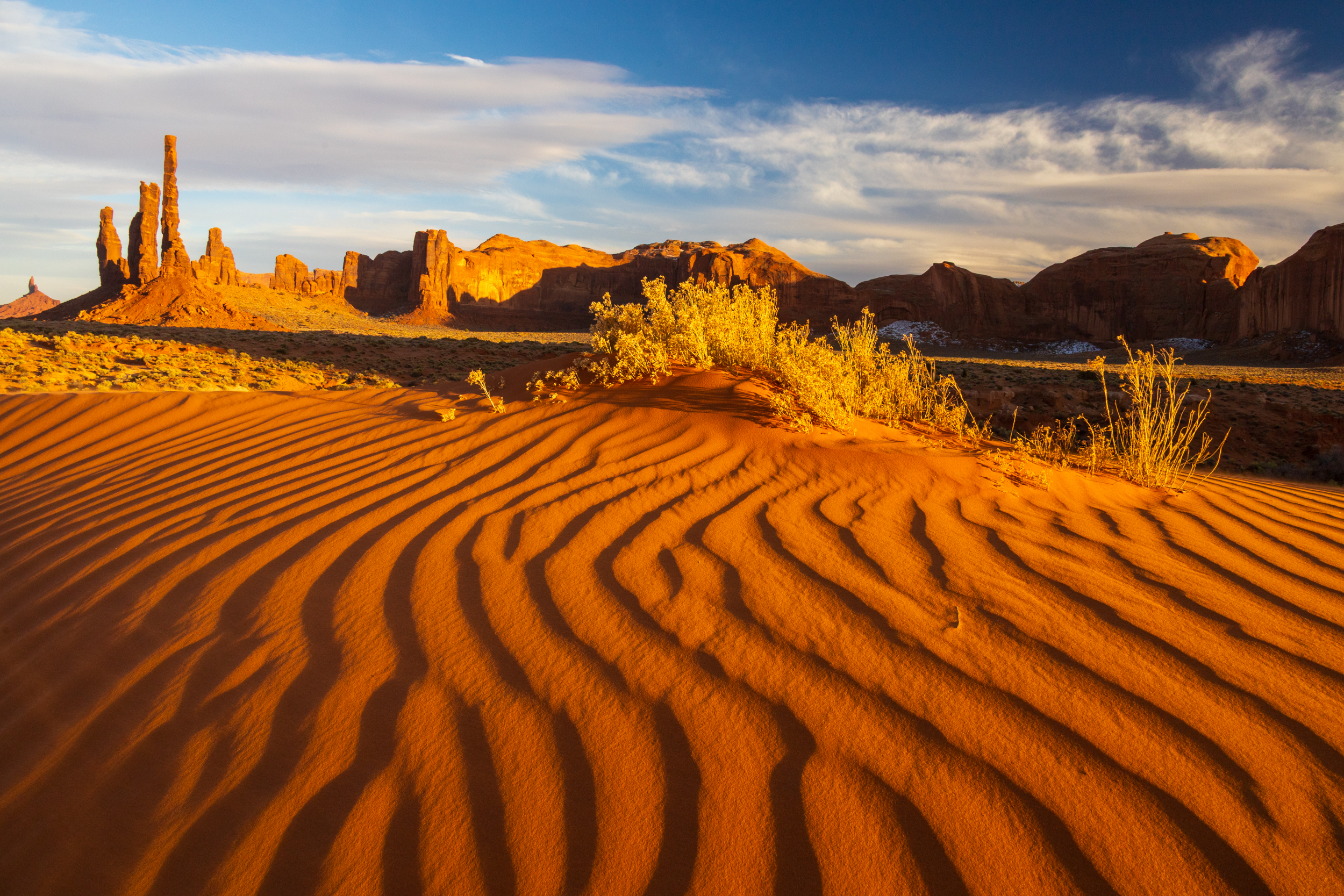 Windswept sand forms natural leading lines toward the towering buttes of Monument Valley, capturing the timeless rhythm of desert wind and stone.
