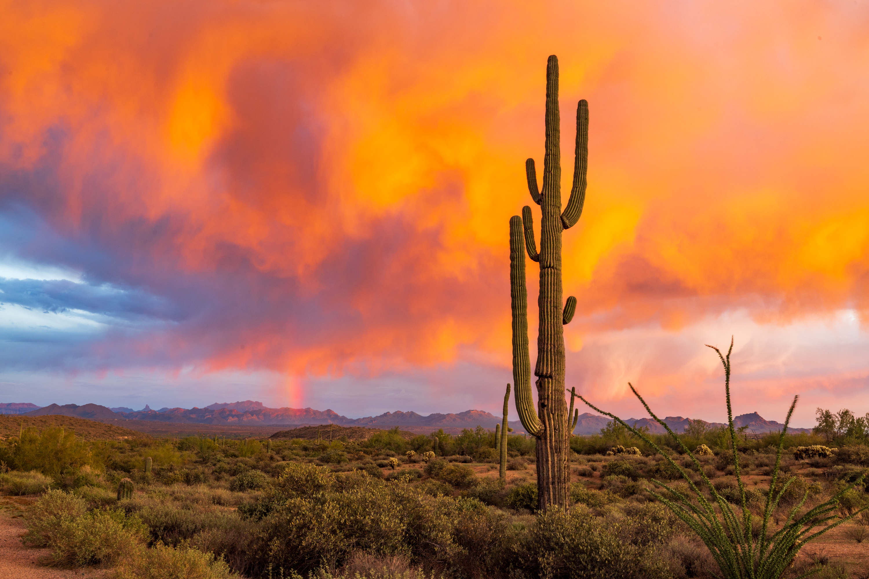A saguaro stands sentinel against a sky ablaze with sunset-orange clouds, while a small rainbow shimmers faintly on the horizon—a fleeting, magical moment in the Sonoran Desert.
