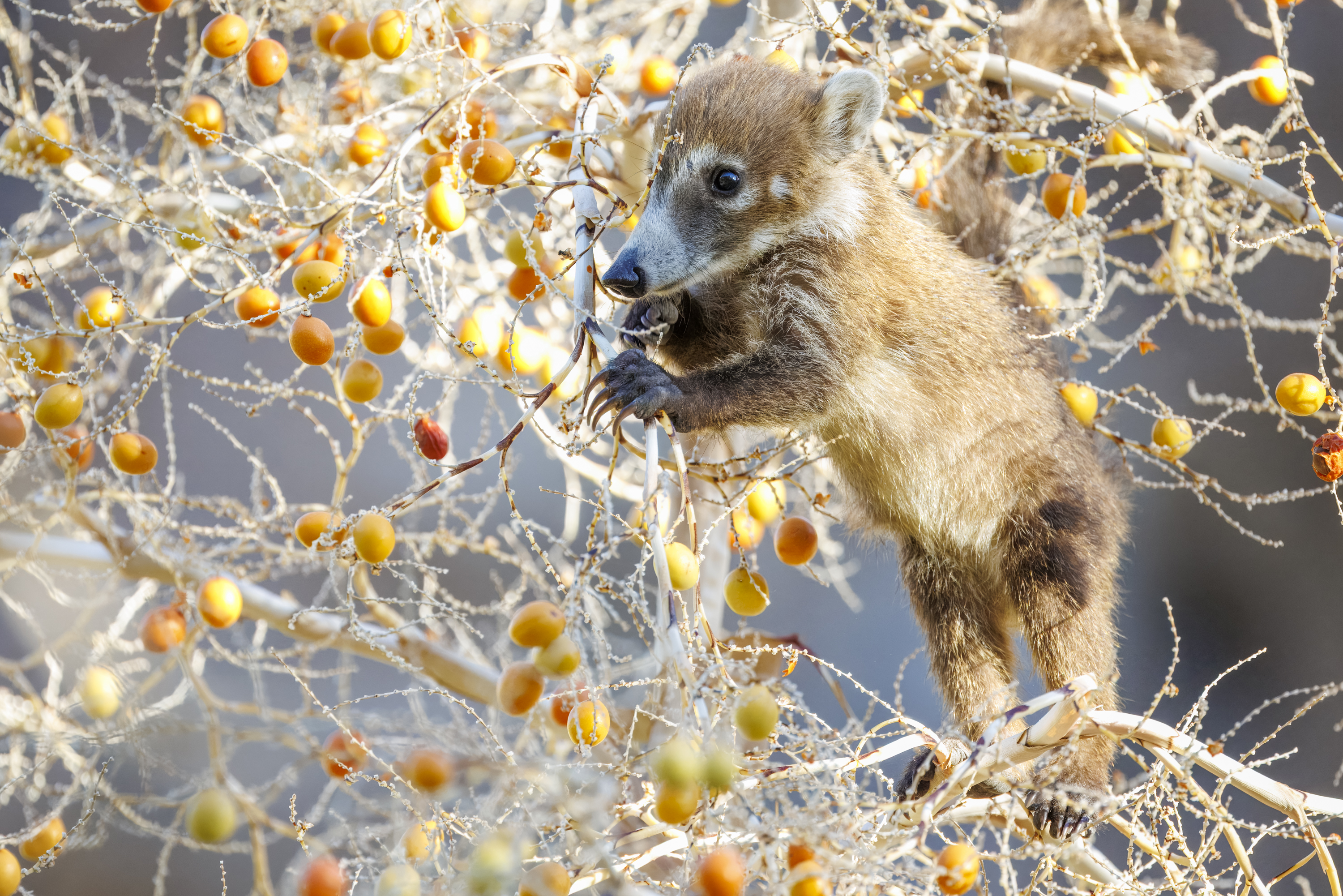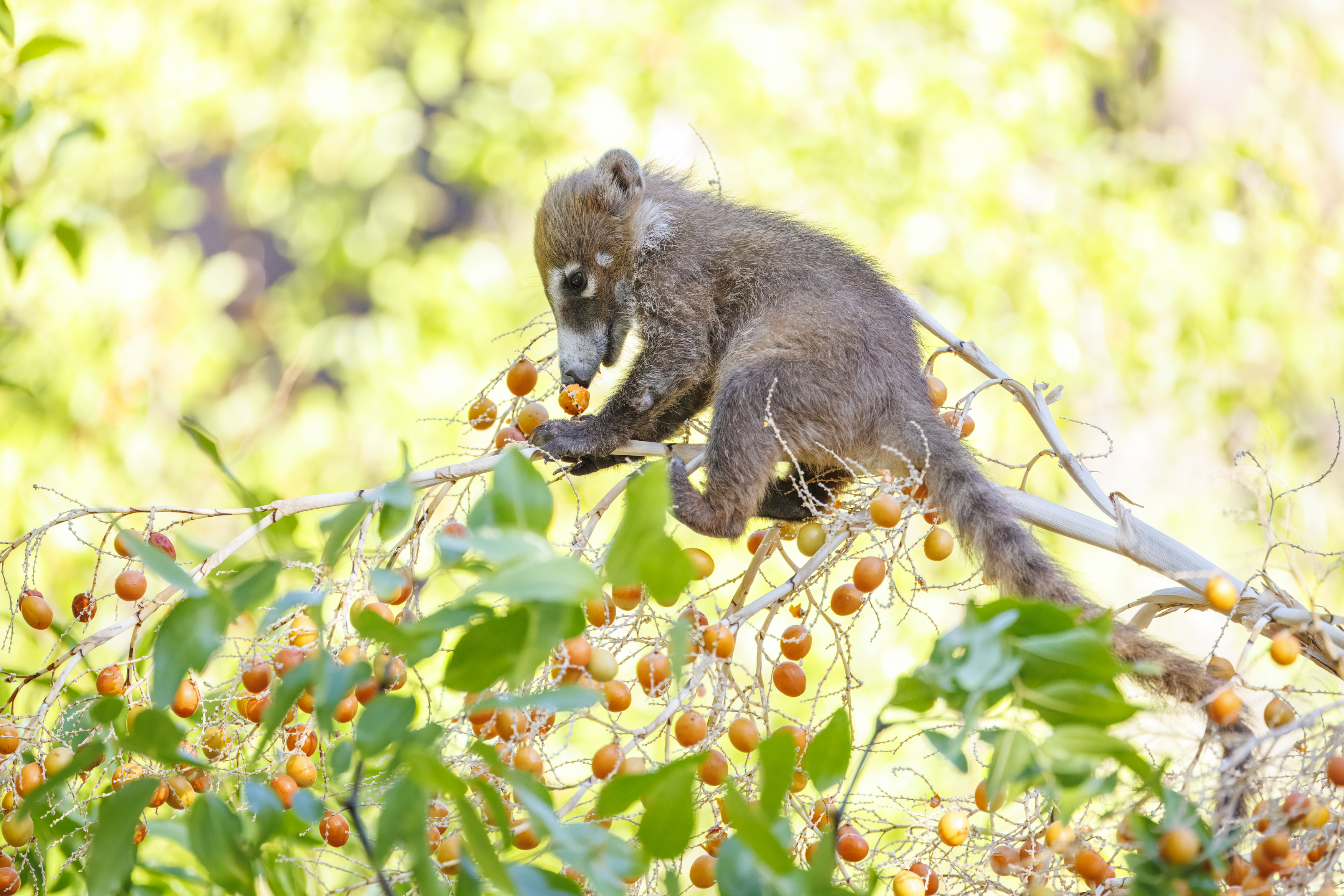 The runt of six White-nosed Coati kits stretches on his tiny legs, determined to reach a juicy Pindo Palm fruit—a playful moment of curiosity and perseverance in the wild.