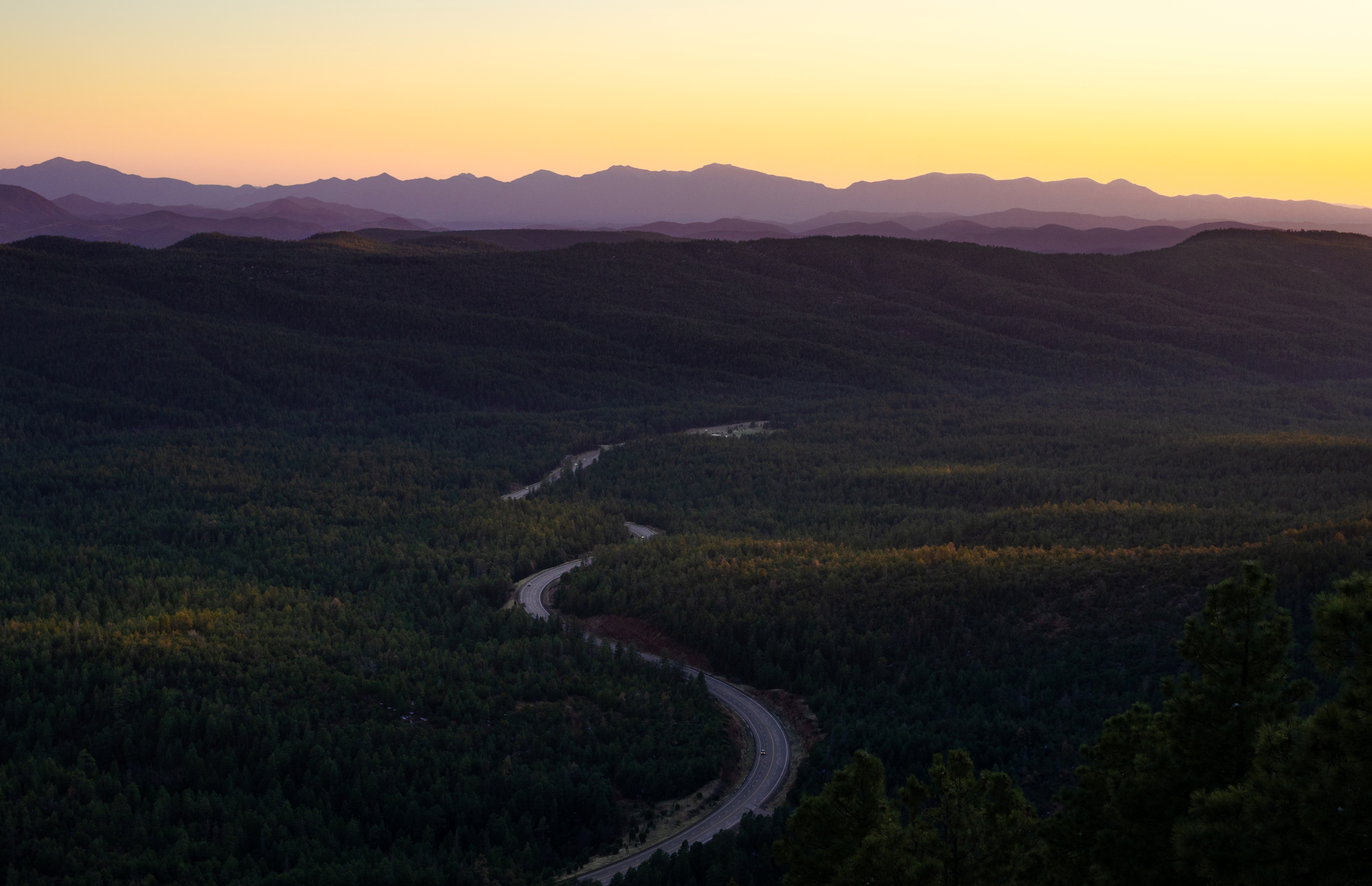 Mogollon Rim overlooks a winding highway and layers of mountains at sunset