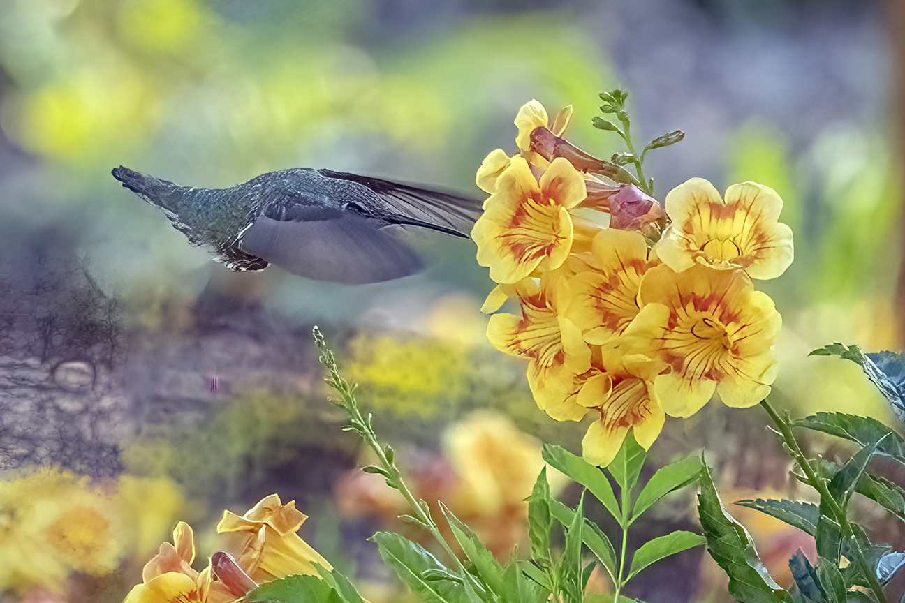 A hummingbird suddenly appears in the garden to enjoy the nectar from the bright yellow flowers.