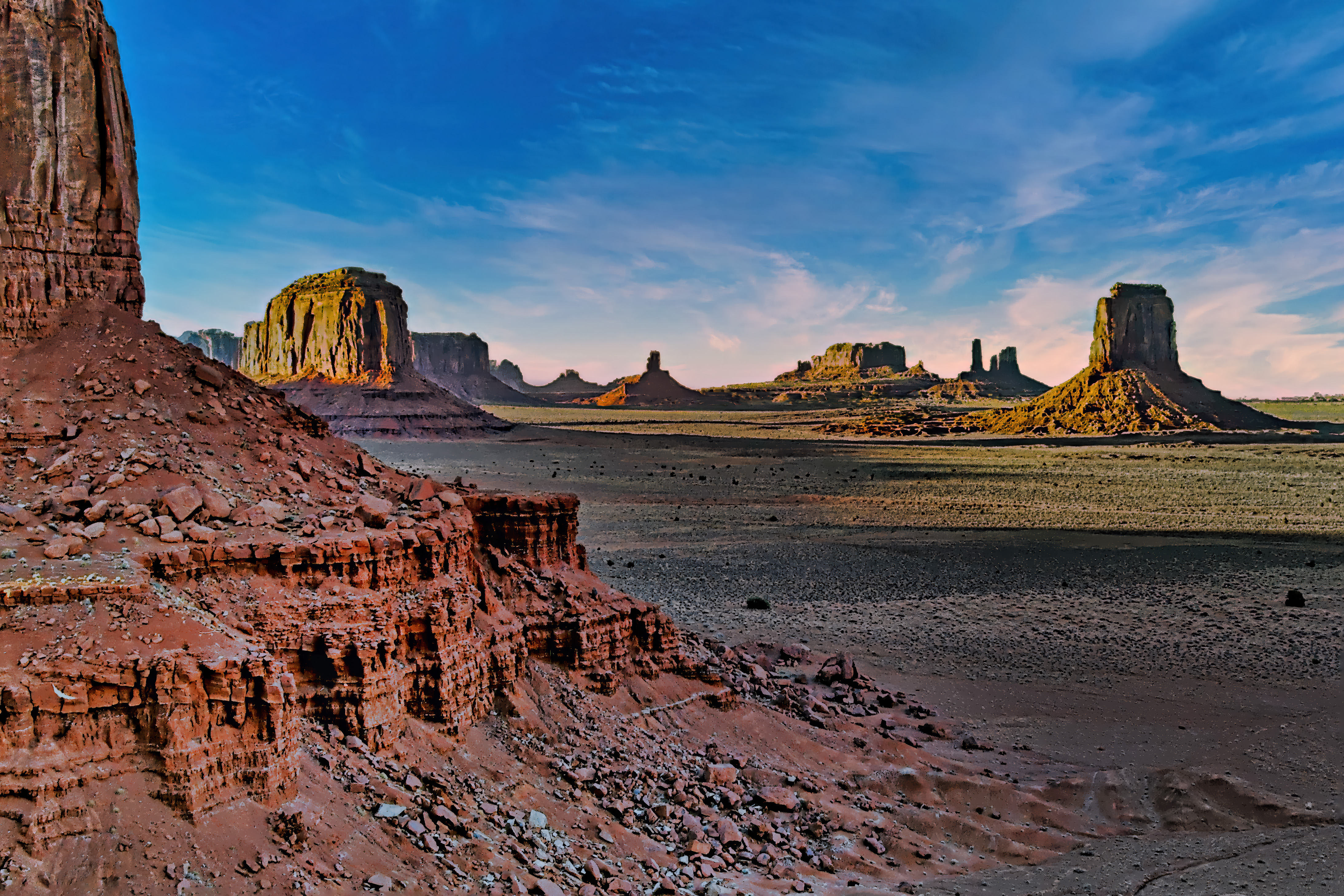 A late afternon view of the buttes and spires in Monument Valley.