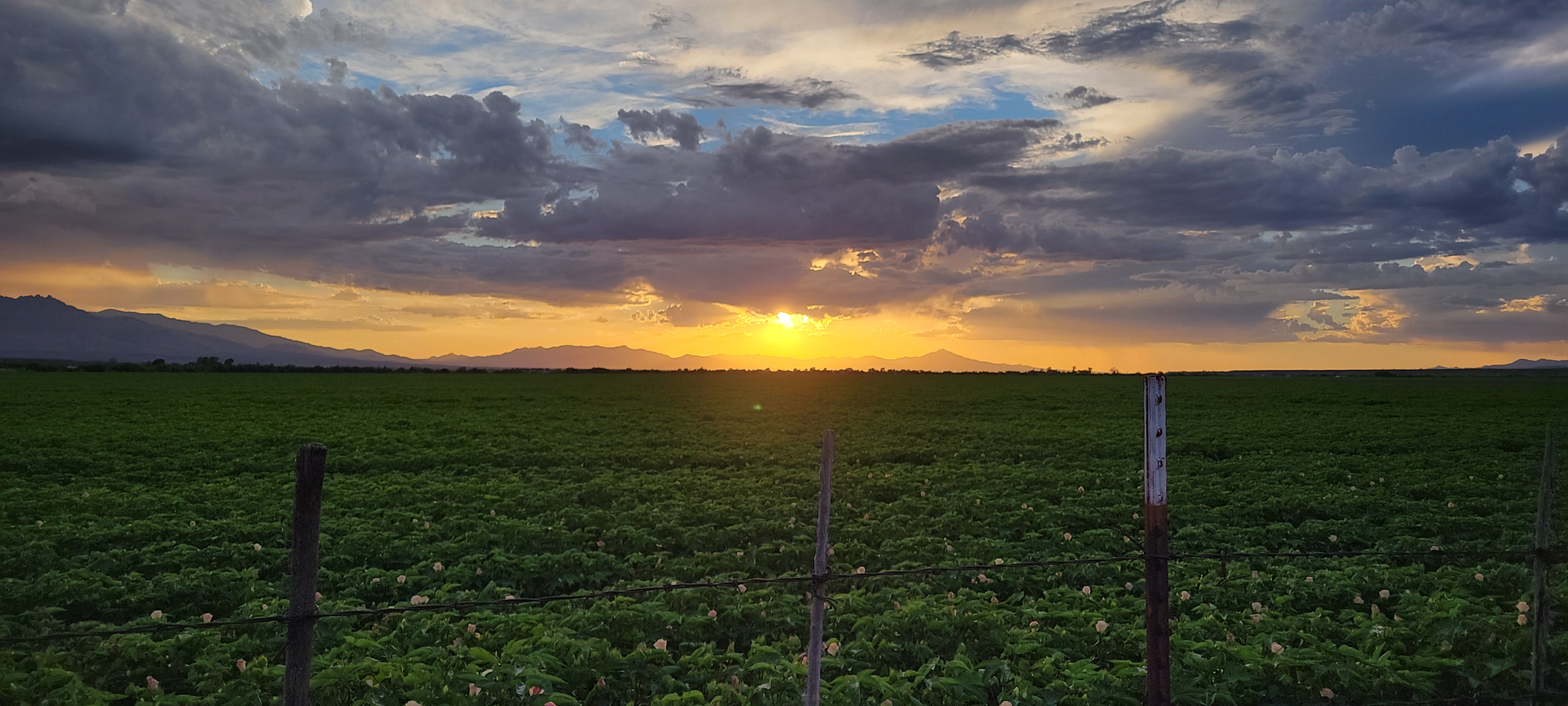 Viewing a cloudy sunset from a cotton field.
