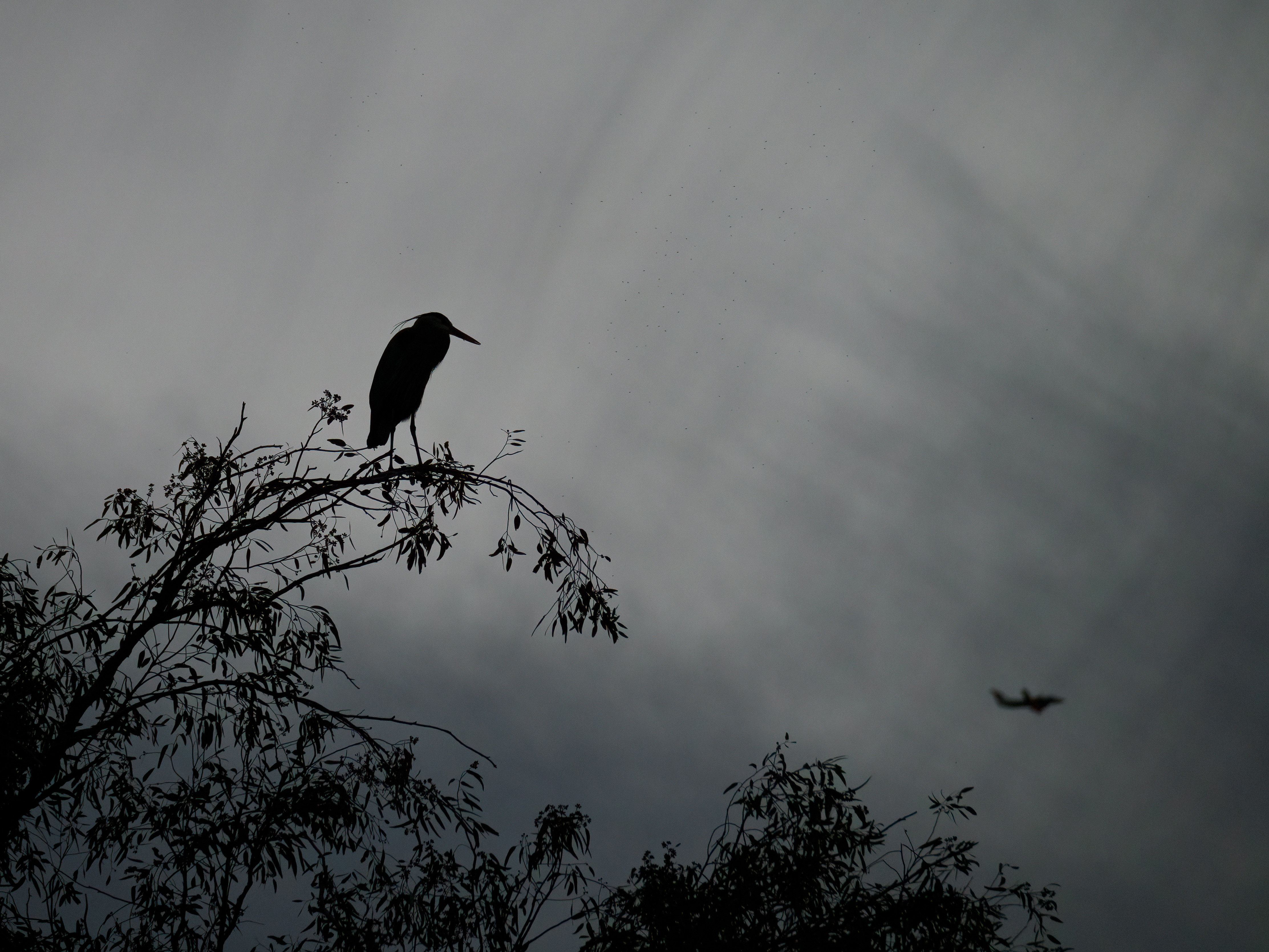 This backlit Great Blue Heron sitting quietly on a branch is seemingly unbothered by either the swarm of gnats nor the airplane in the distance.