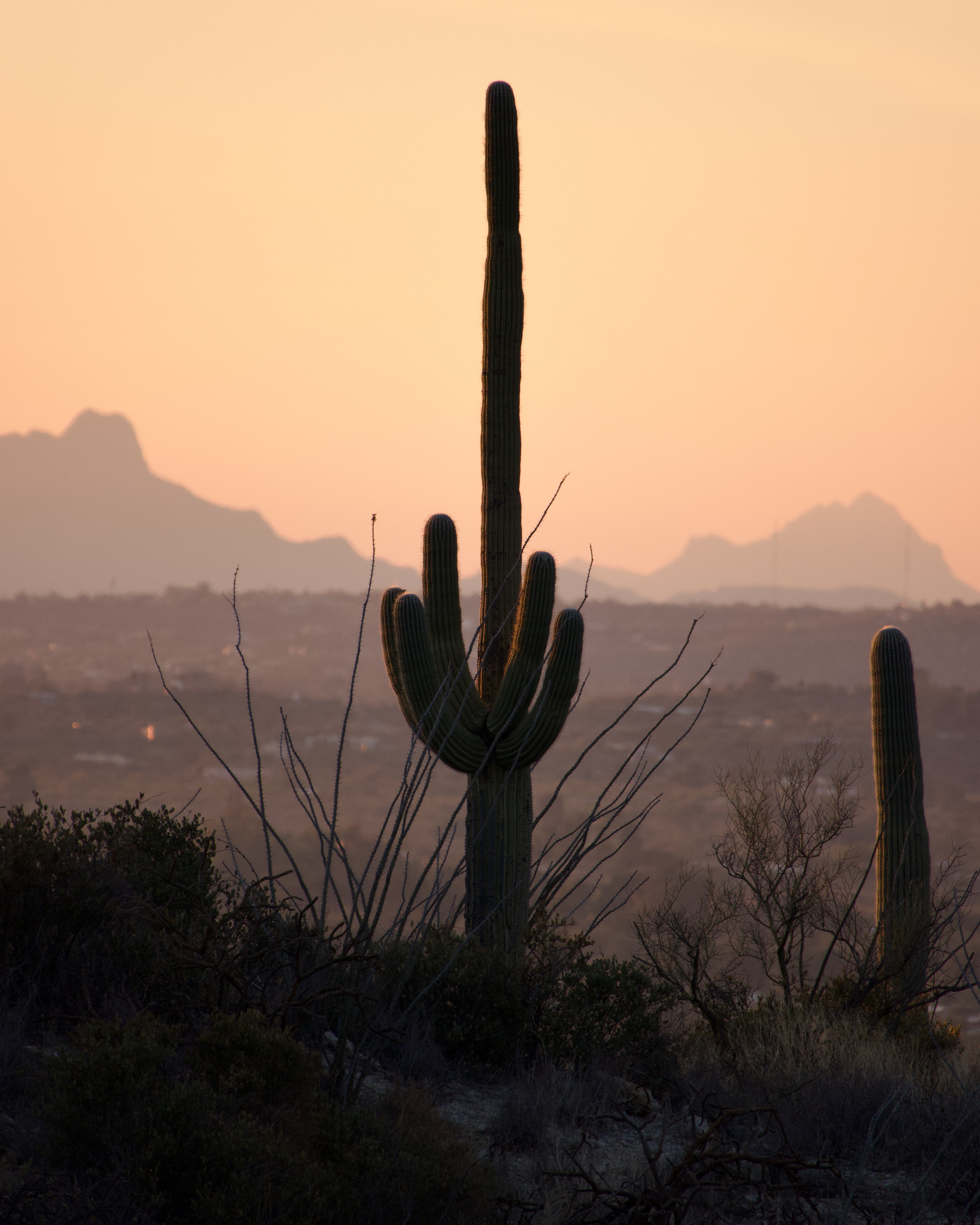 A towering multi-armed saguaro stands beneath the rising moon at Tom’s Thumb Trailhead, McDowell Sonoran Preserve.