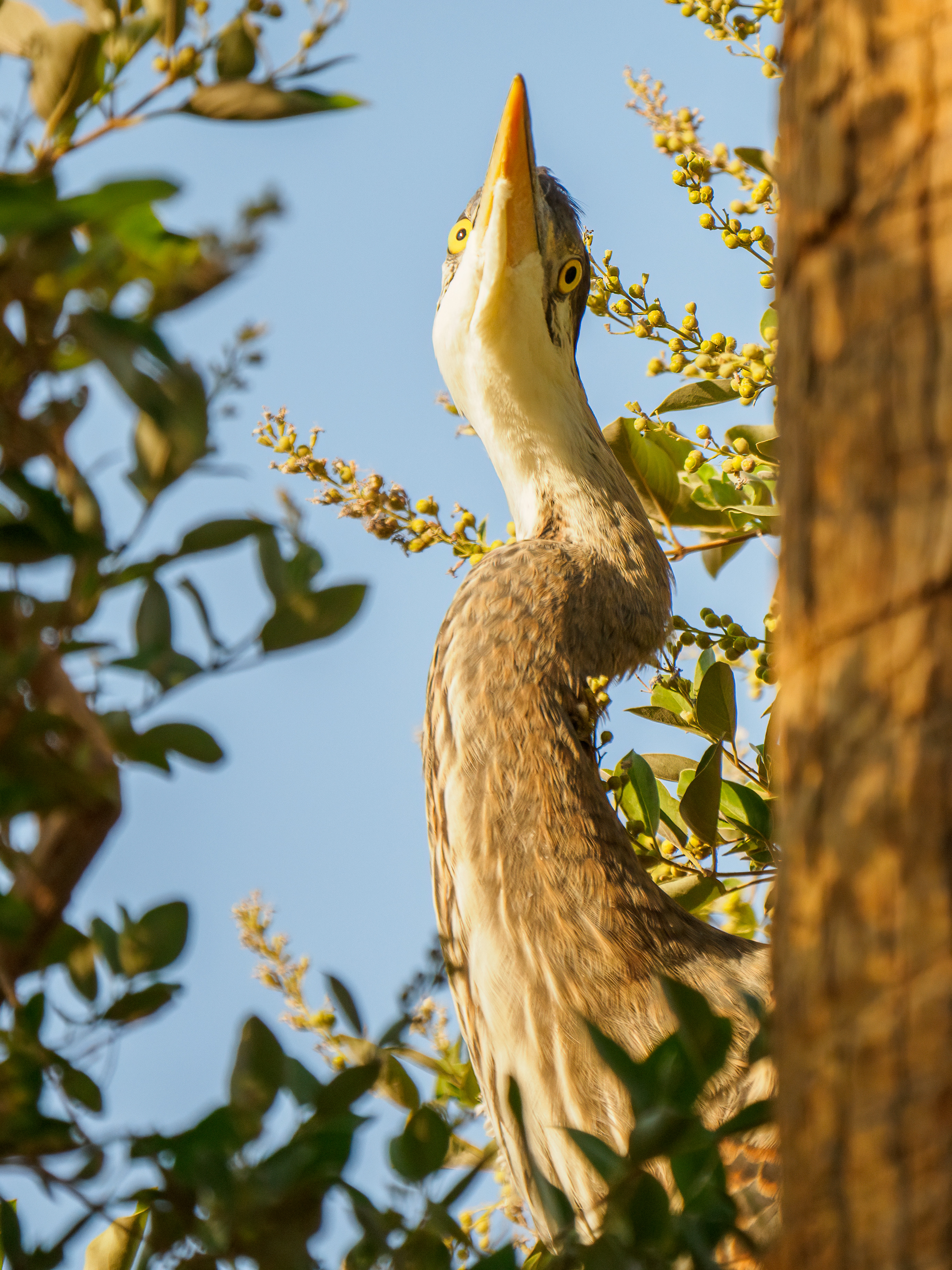 A juvenile Great Blue Heron which had left the nest too early had found safety in a nearby low olive tree. The unusual angle made it feel like an "Awkward Yearbook Photo".