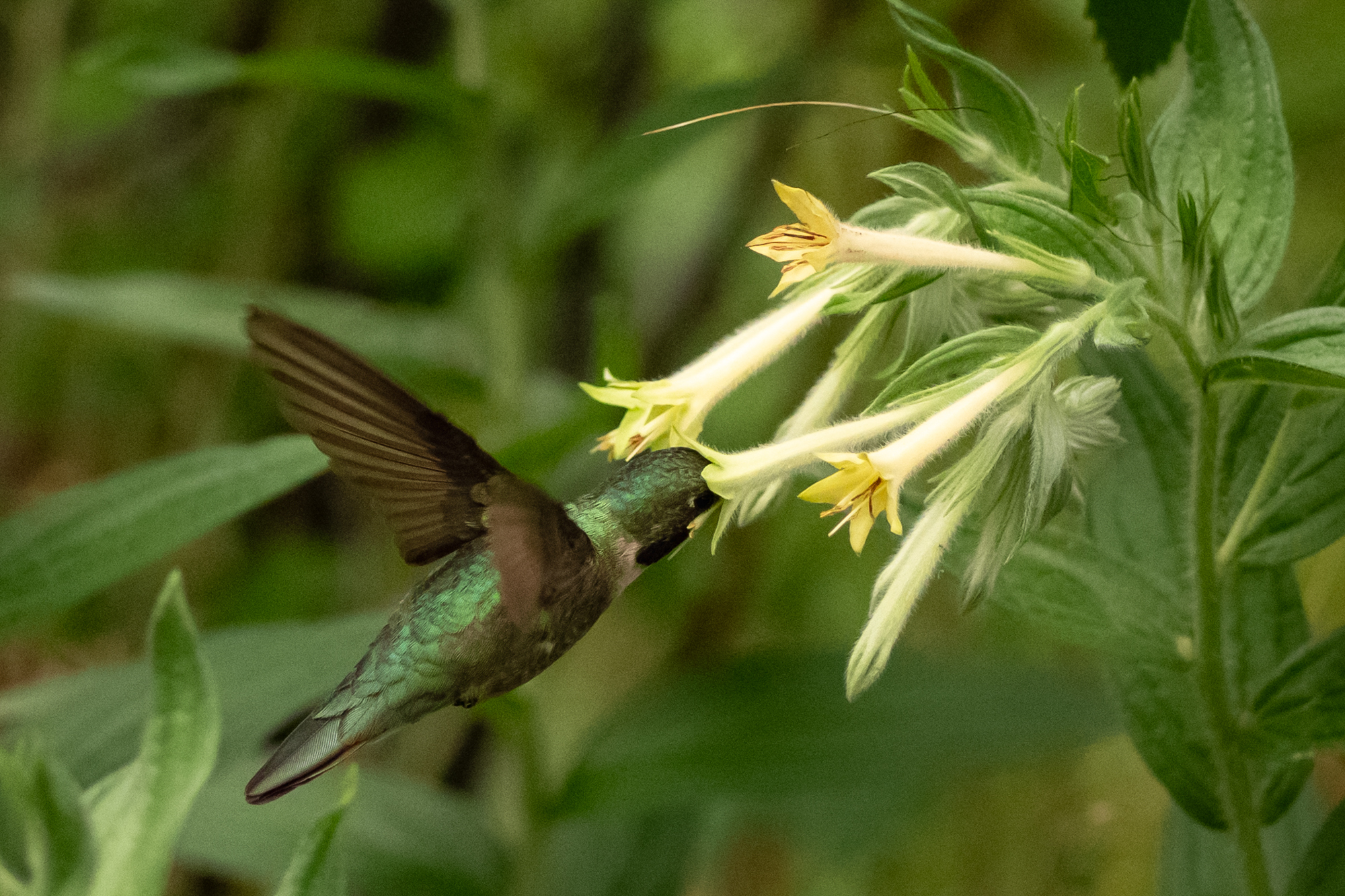 While I took macro photographs these white flowers, I heard a loud buzzing. As I paused to identify the source of the sound, this hummingbird zipped around and in front of me for several minutes.