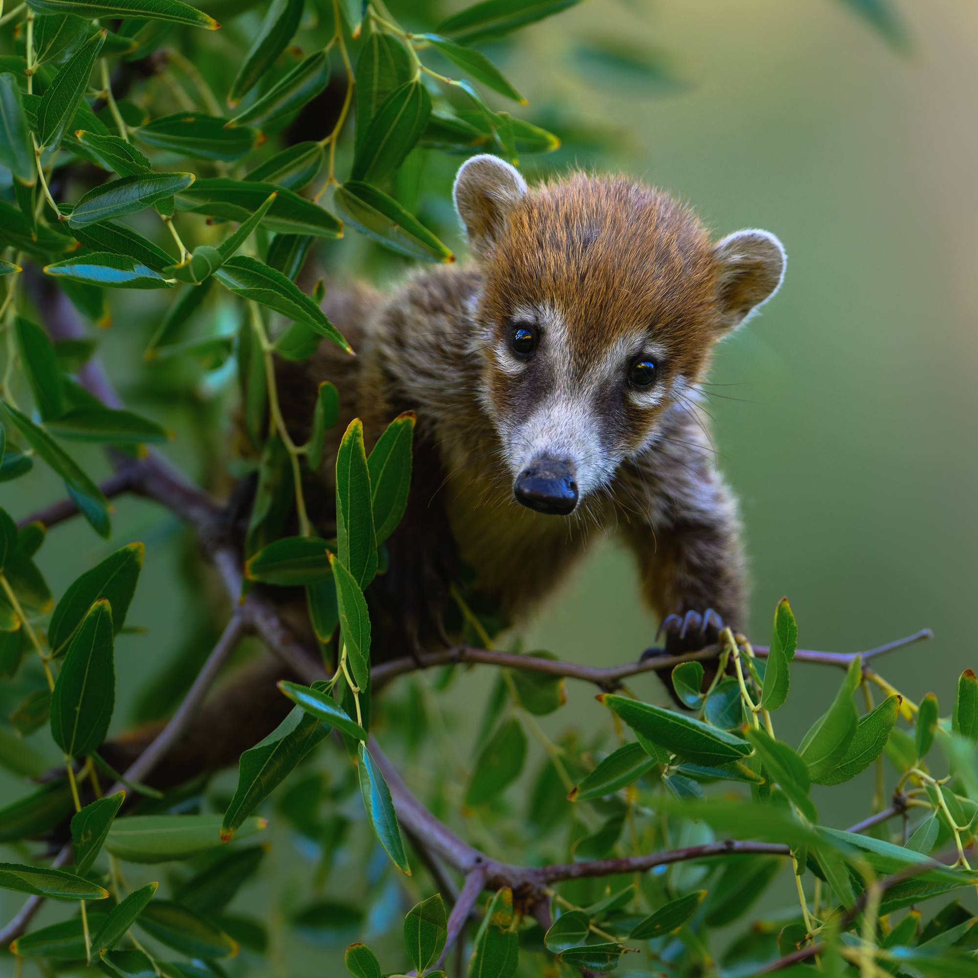A Coatimundi kit foraging for food at the top of a fruit tree.