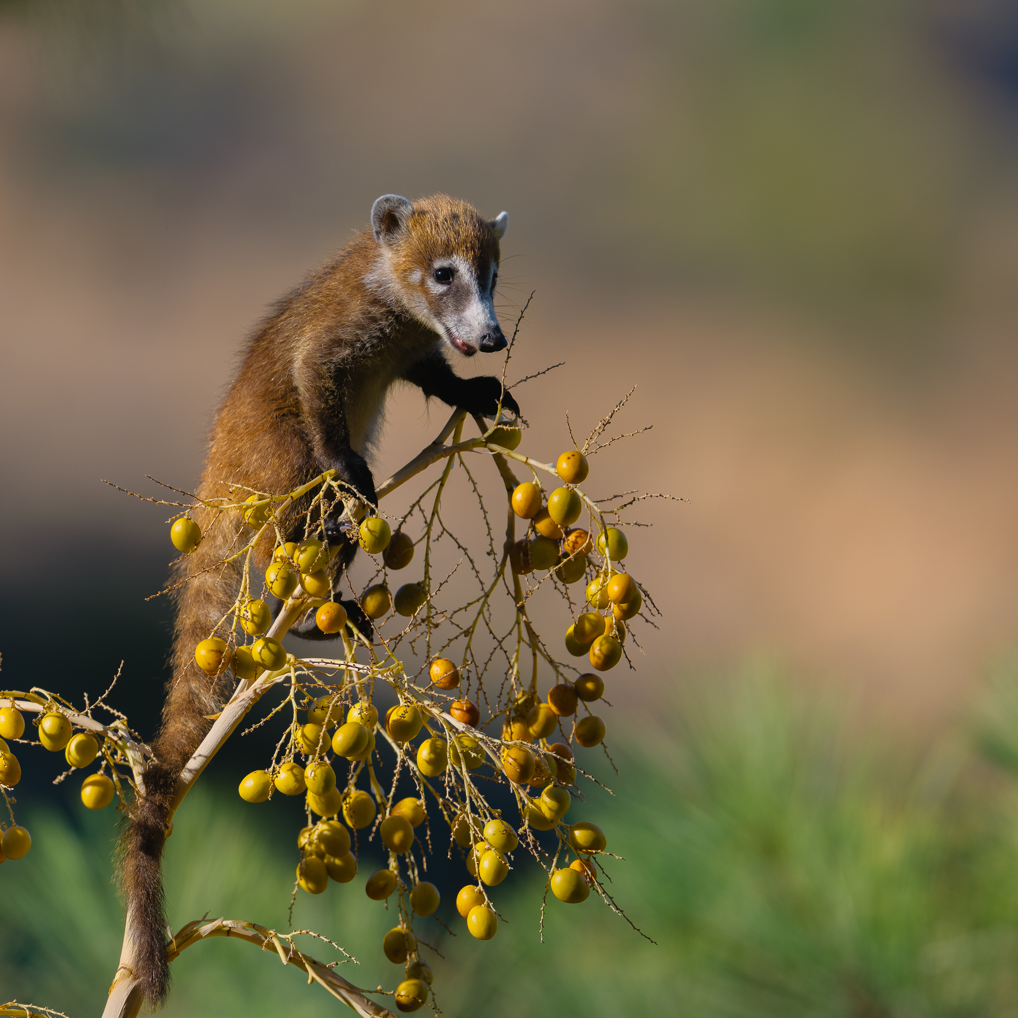 A Coatimundi kit foraging through a tree feasting on its fruit.