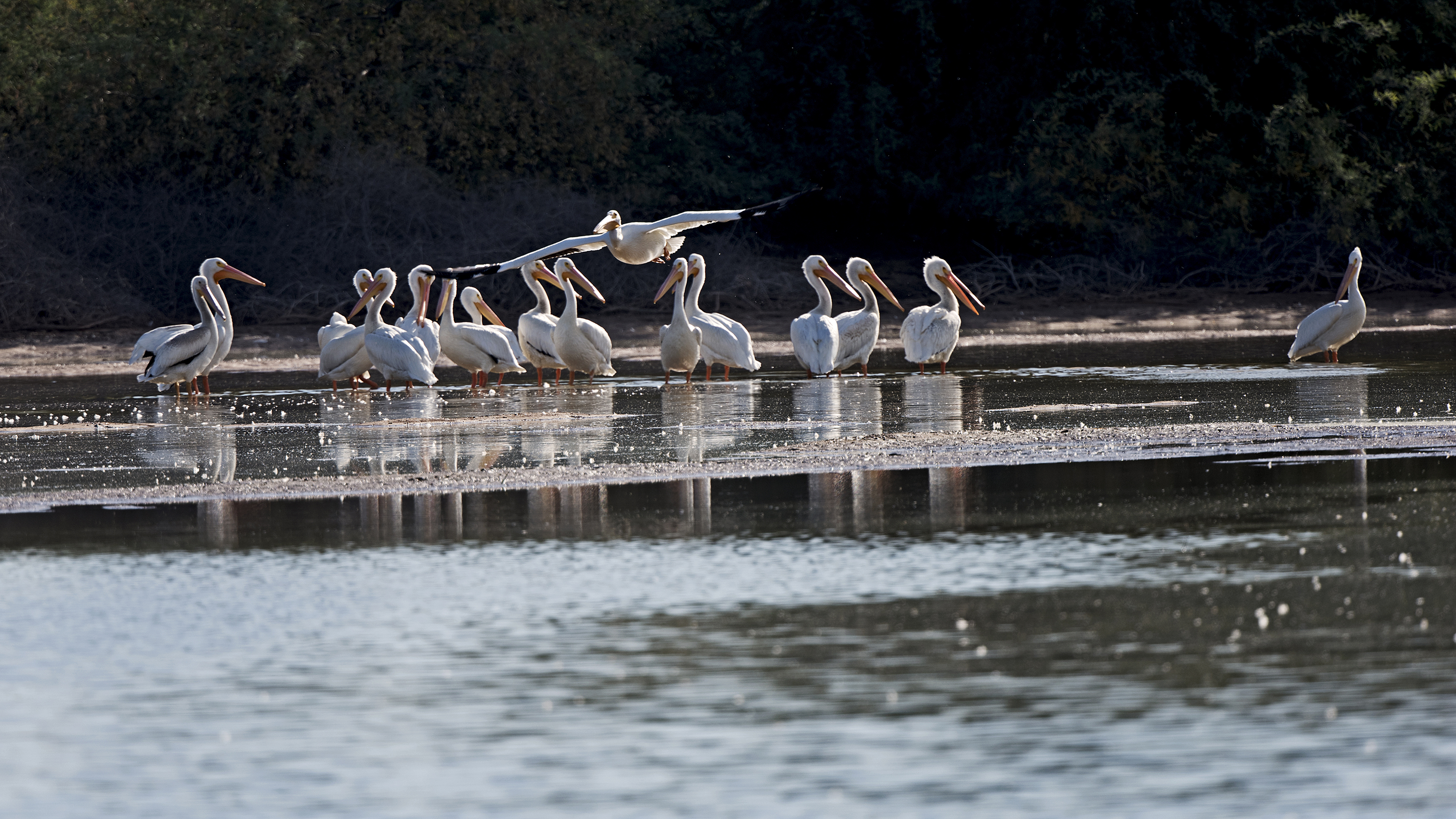 Pelican family enjoying morning sun while one of them was flying. Riparian Preserve.
