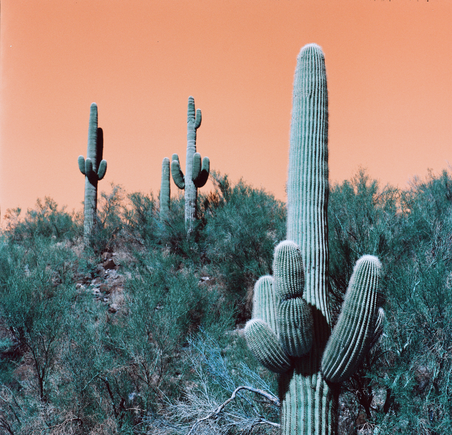 Saguaros above Snake Spring Wash, near Burro Creek Recreation Site. The coloration of the photo is due to the type of film used to capture the image.