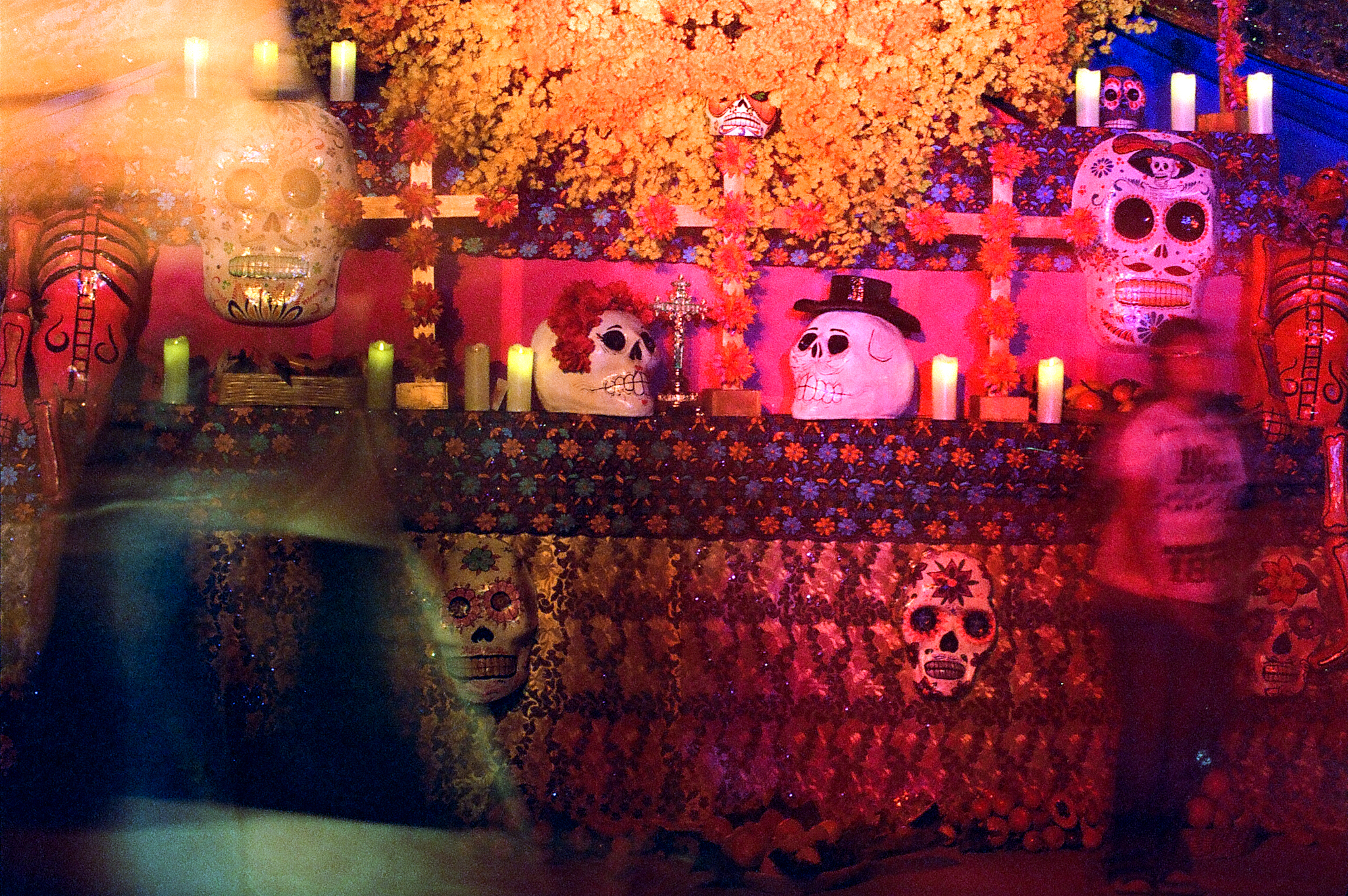 Festival goers pass by an ofrenda, at the 2025 Scottsdale Dia de Los Muertos Festival.