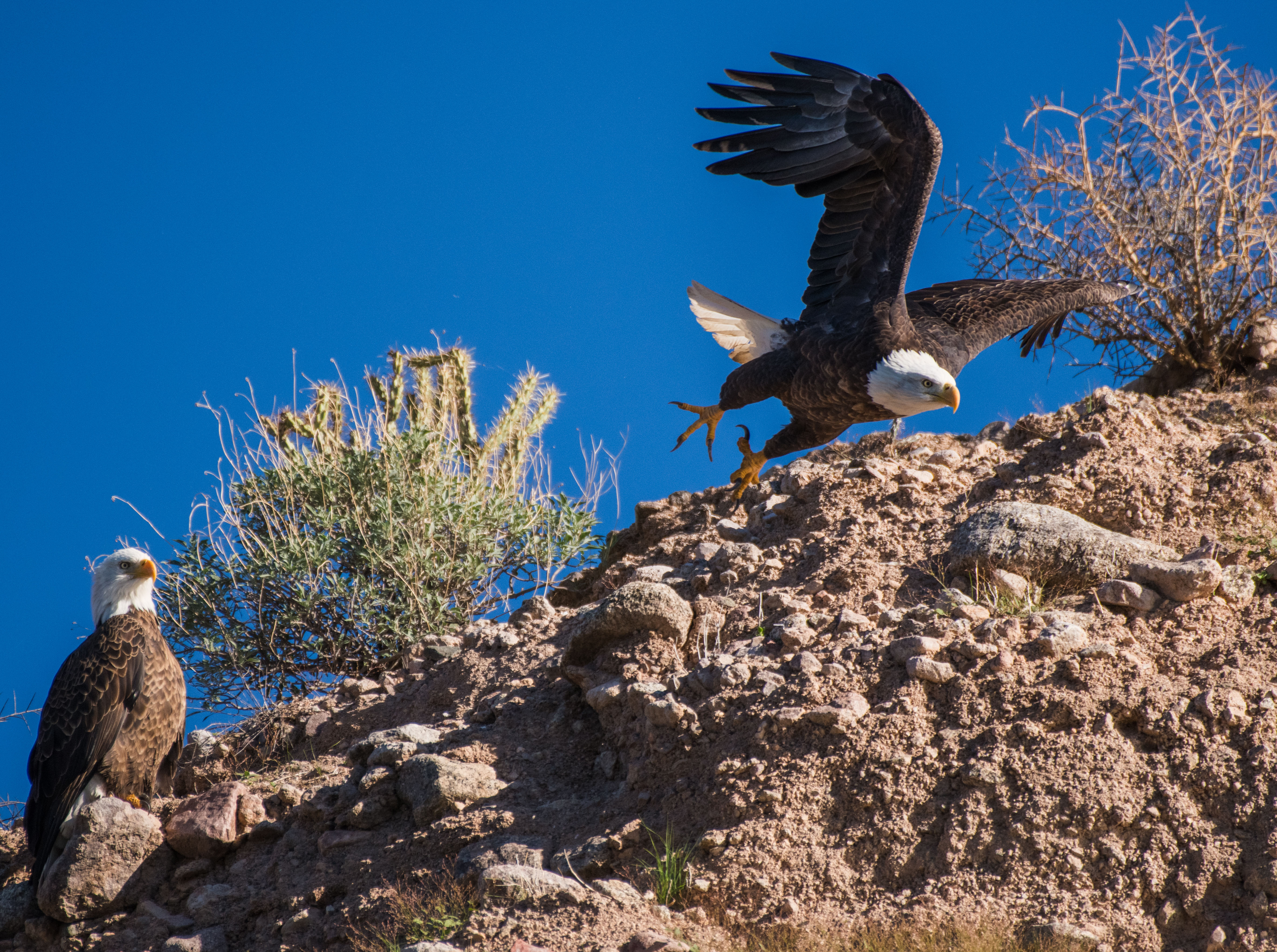 One commands the skies, the other commands the mountain—two eagles claiming the desert as their kingdom.