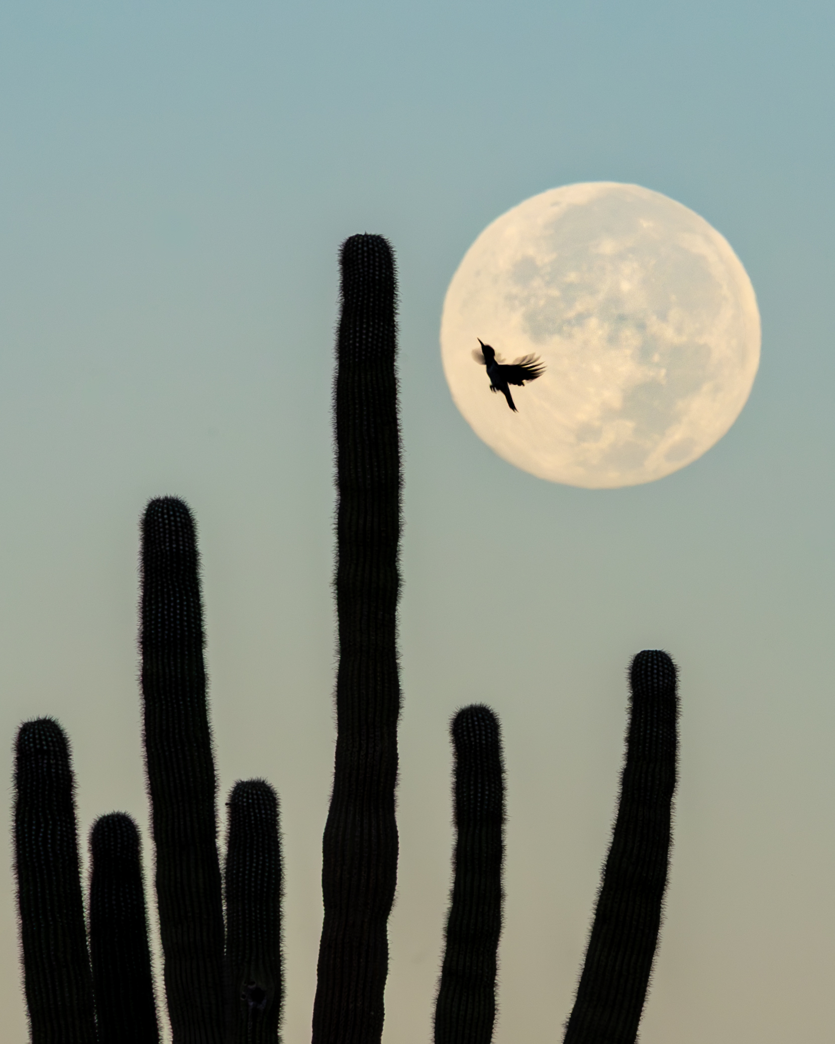 A bird seeks the highest point of a saguaro, just as the sun rises and the moon sets. Title: Up To The High Perch