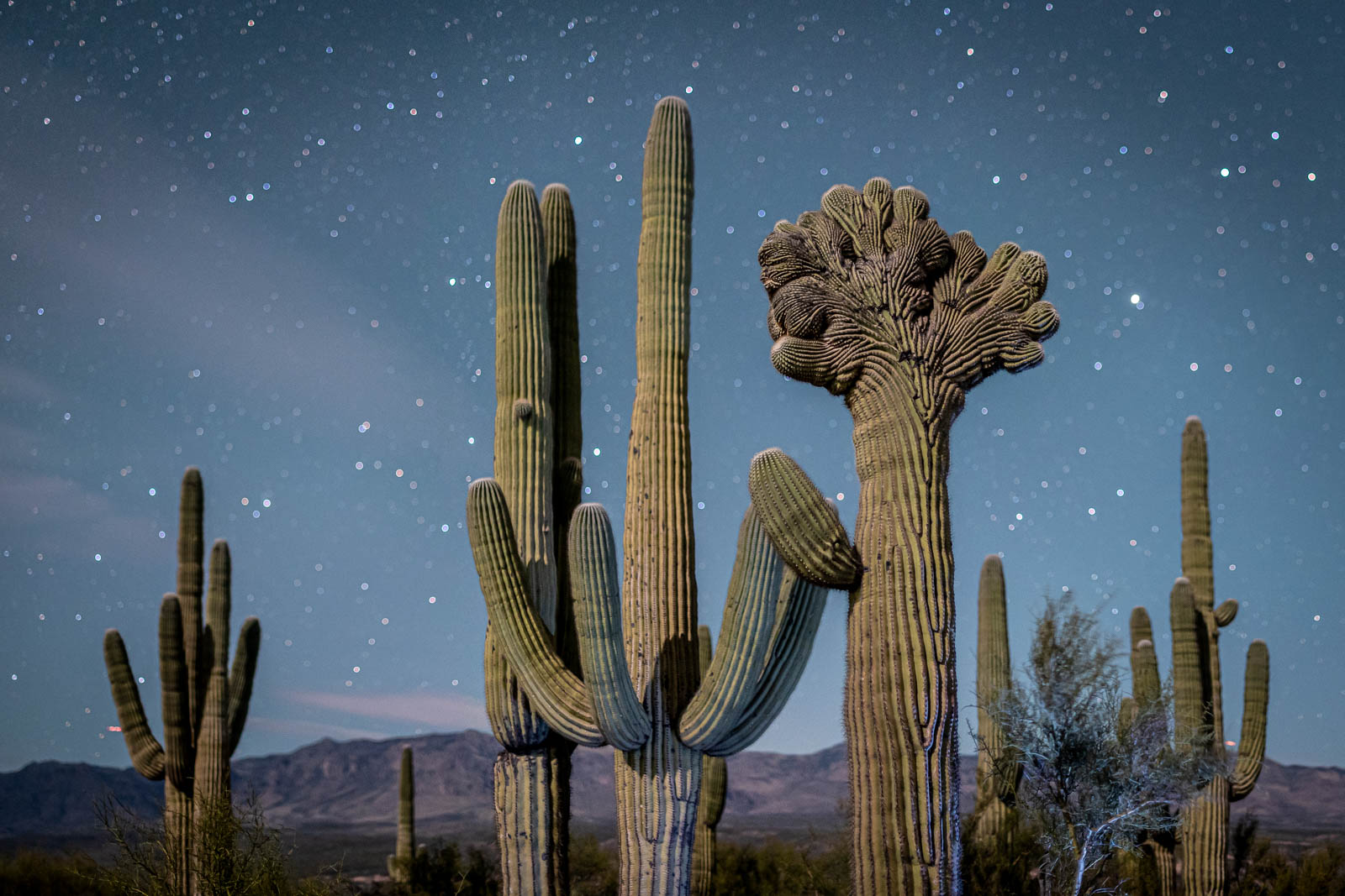 Saguaros under full moon with out of focus stars