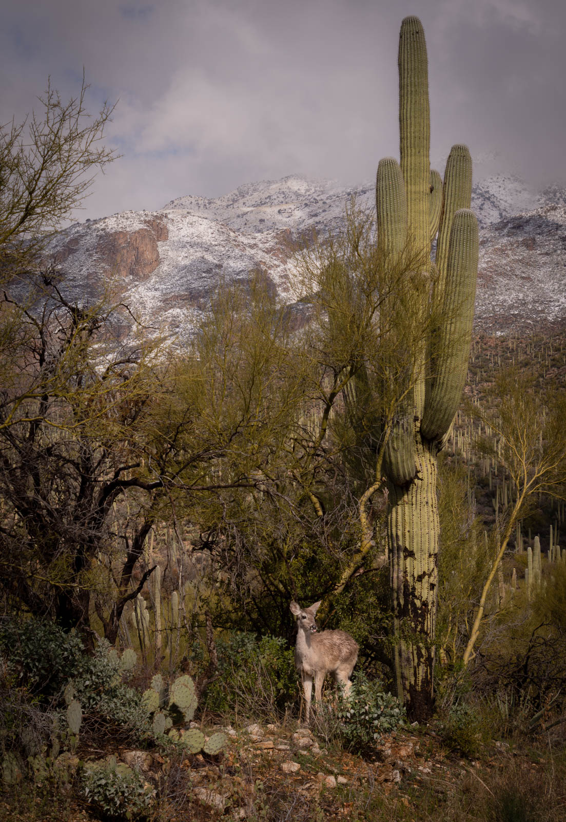 Fawn in desert with saguaros and snow-capped mountains
