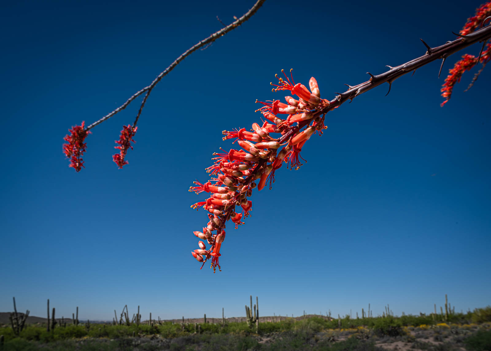 Ocotillo flowers against clear blue sky, saguaros in background