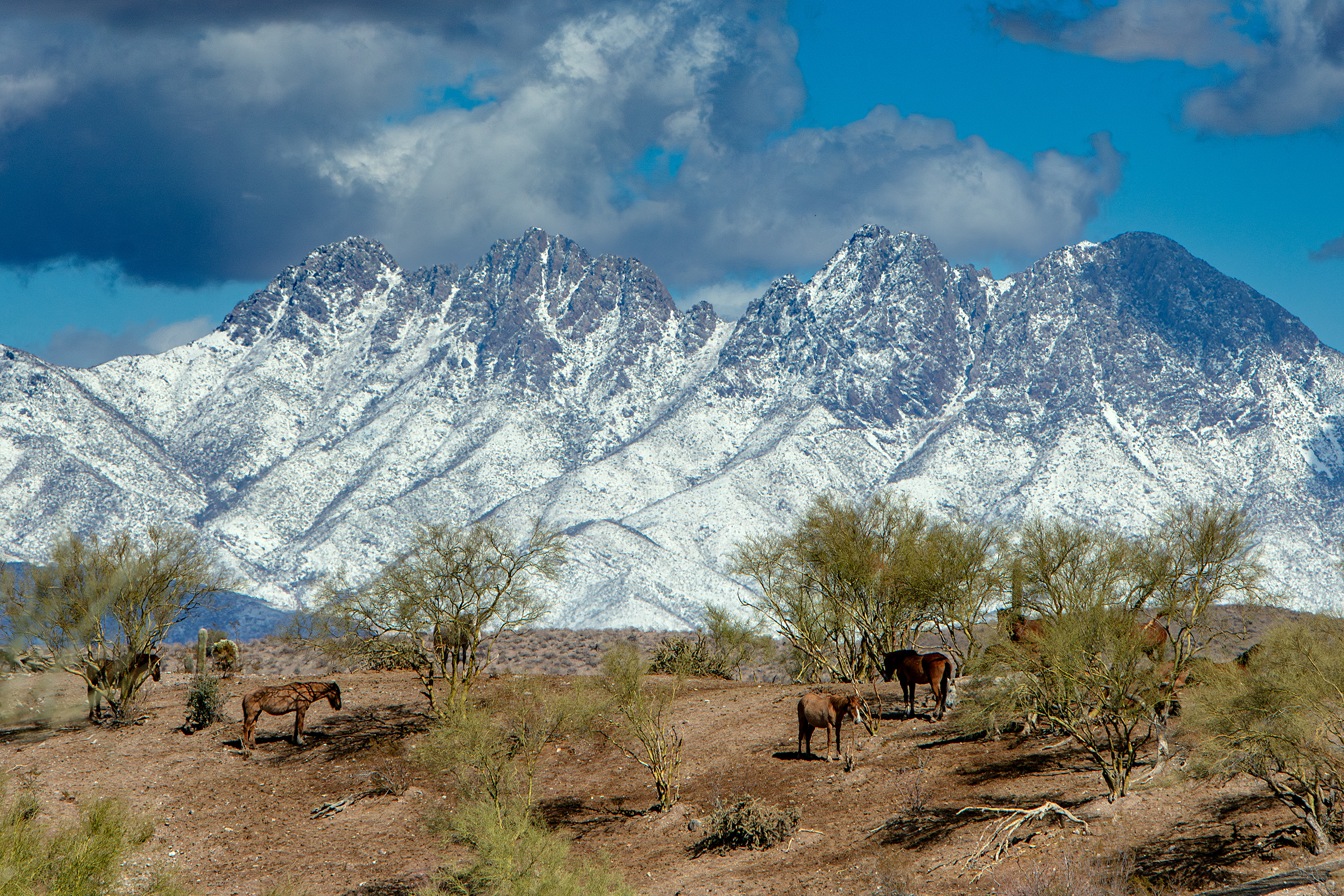 Horses enjoying the sun the day after a winter storm covered Four Peaks in snow.