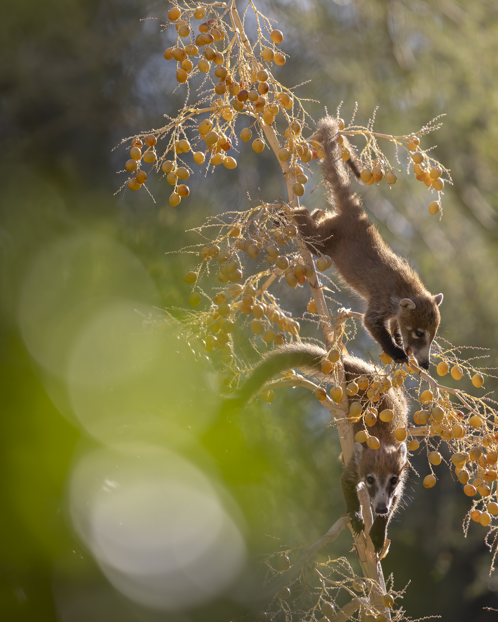 Baby coati's picking treats of the tree.