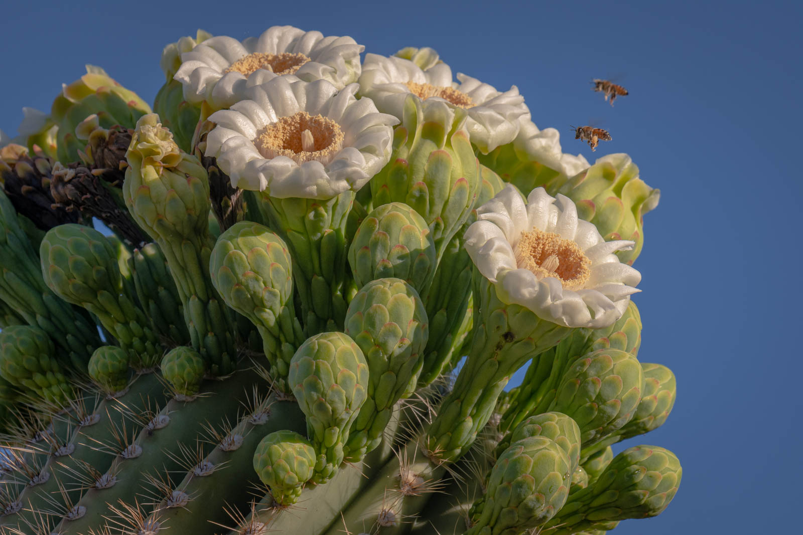 Close-up of Saguaro blossoms with honeybees hovering