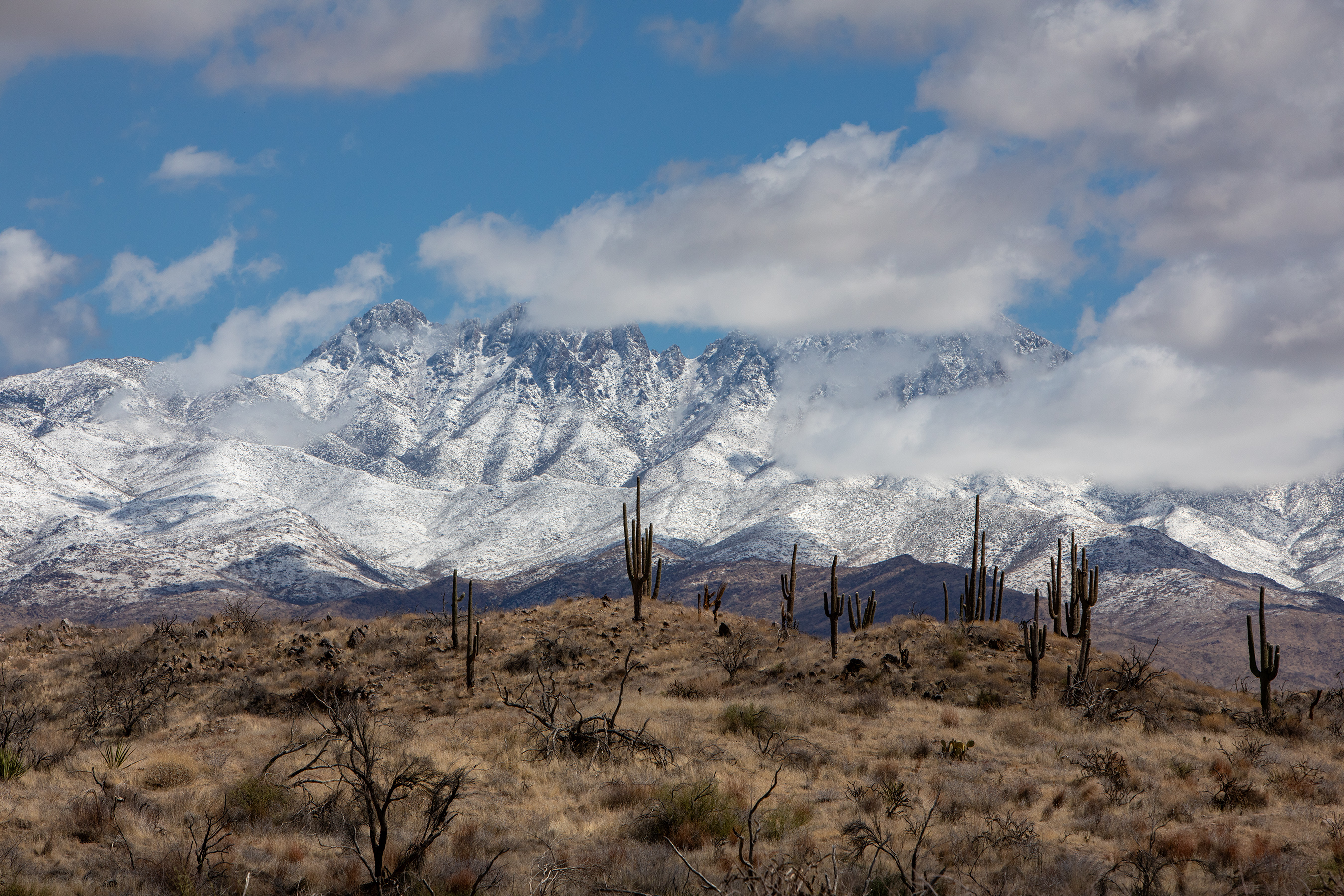 Four Peaks covered in snow after a March 2025 winter storm.