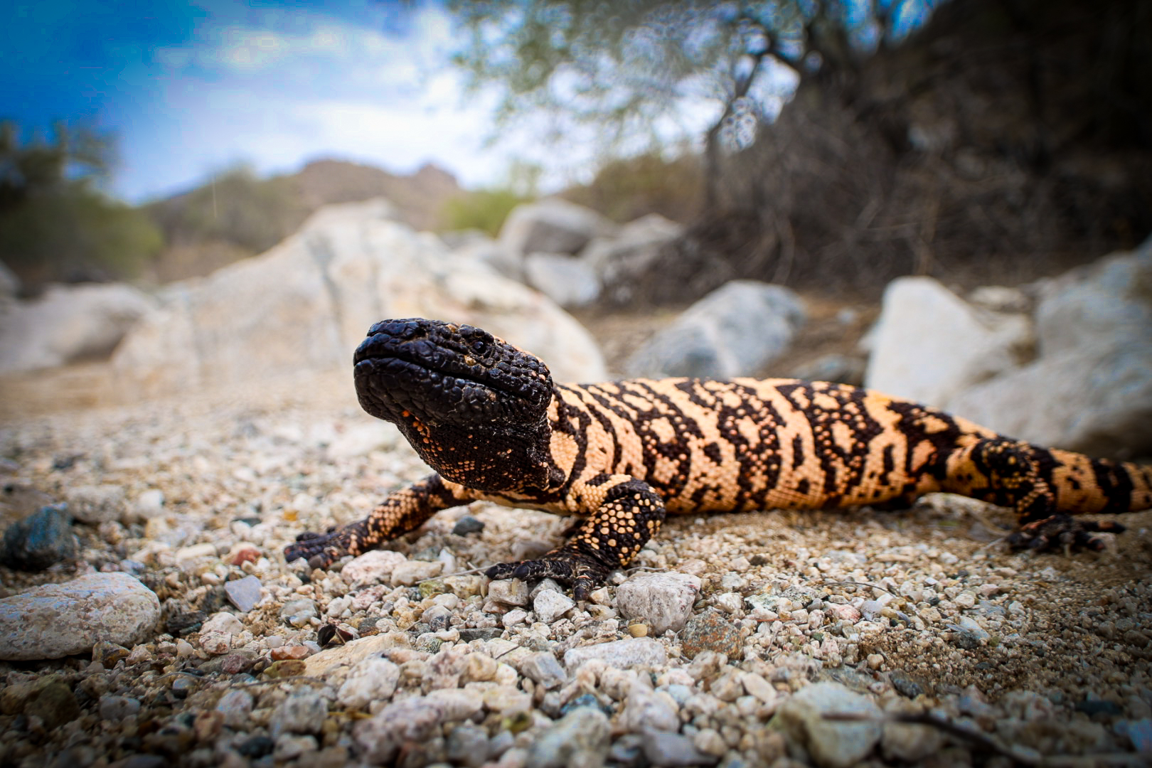 A gila monster (Heloderma. suspectum) enjoying the ambient humidity after a brief morning shower. These venomous lizards especially like sandy washes with boulders the can scale and burrow under.