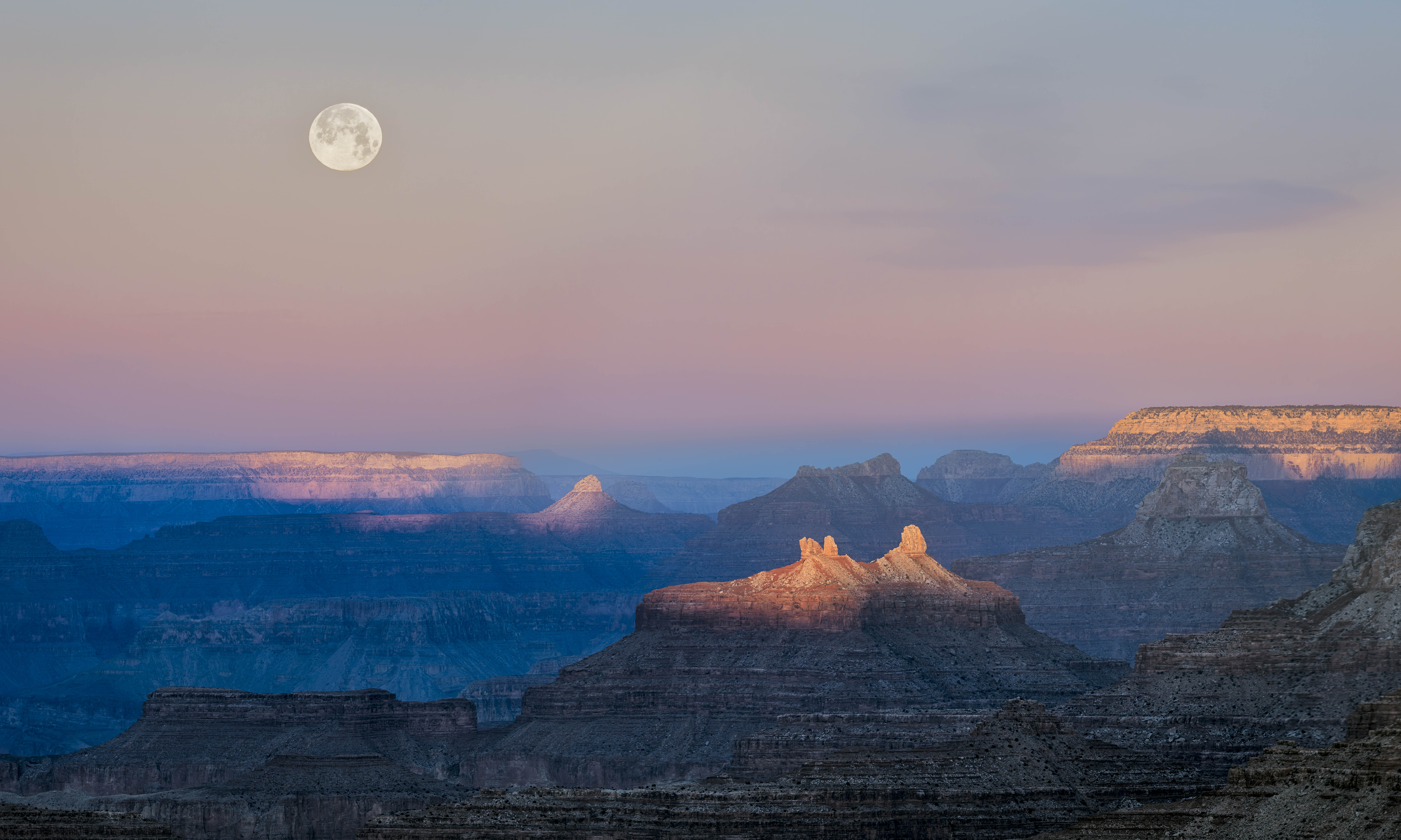 The Moon sets over the Grand Canyon just as the sun begins to rise. You can see two shadows in this photo; one of the earth and the other from the prominent feature on the next canyon layer.