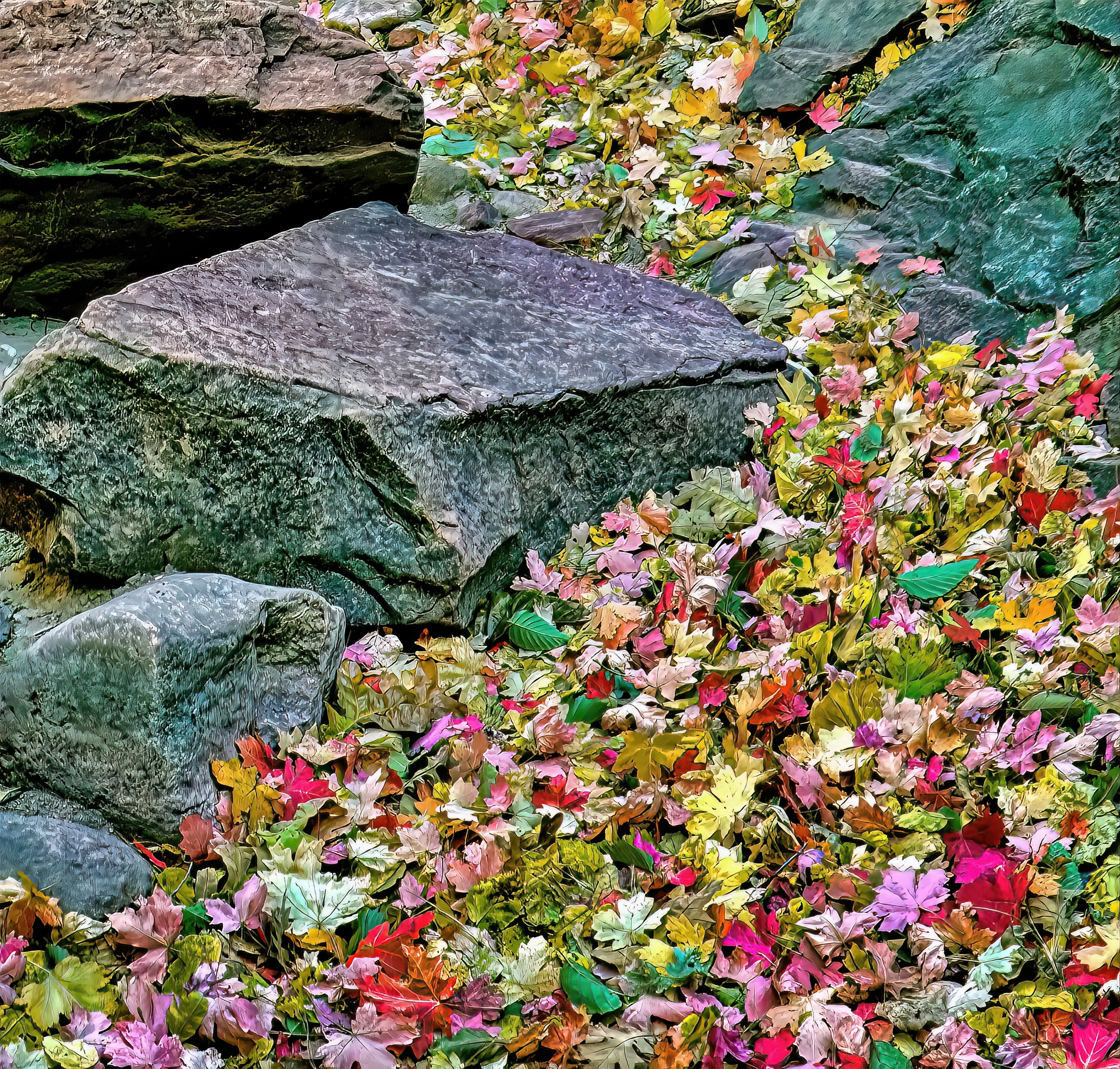 Autumn leaves cover a dry creek bed in Oak Creek Canyon.