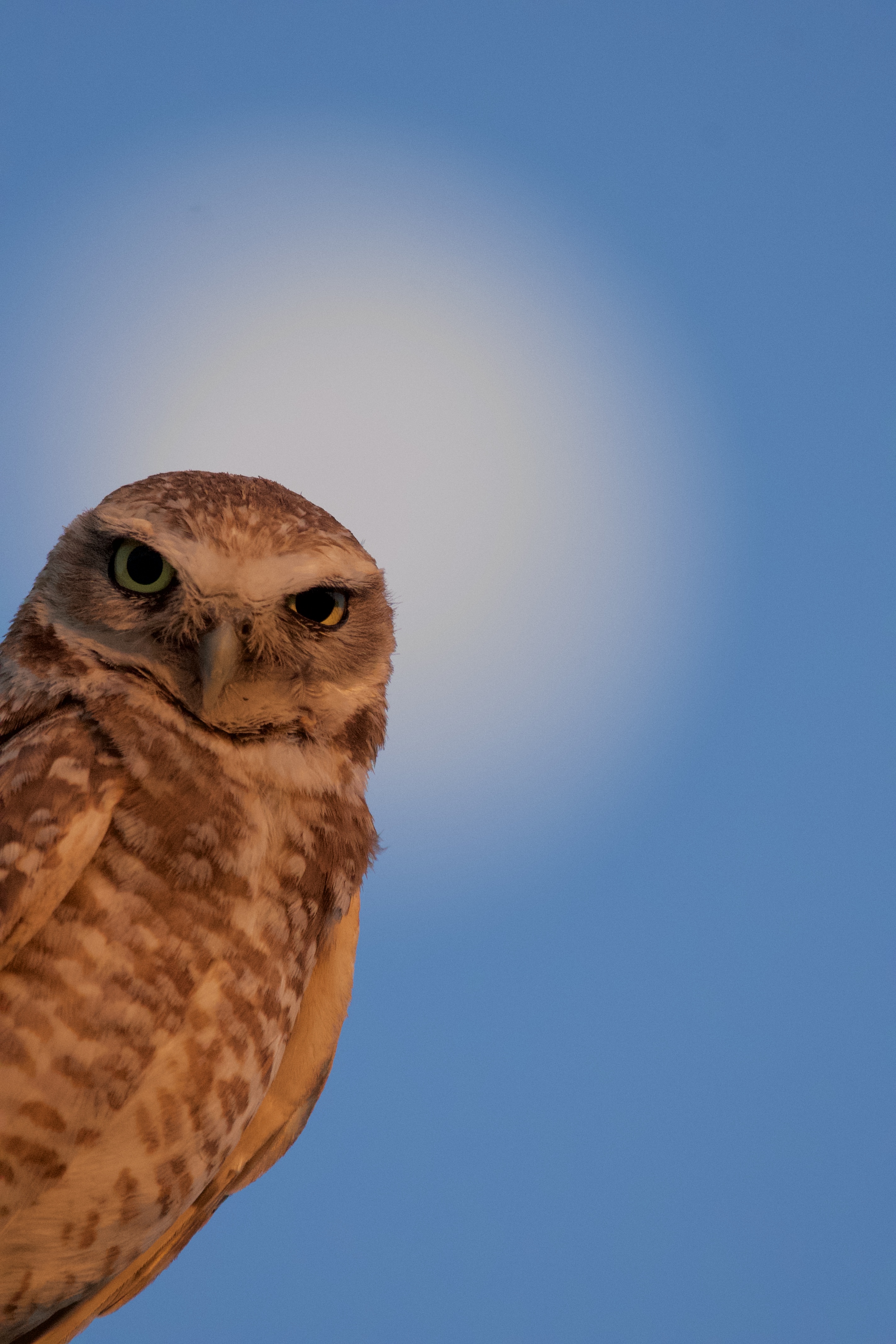 A burrowing owl poses in front of the full moon