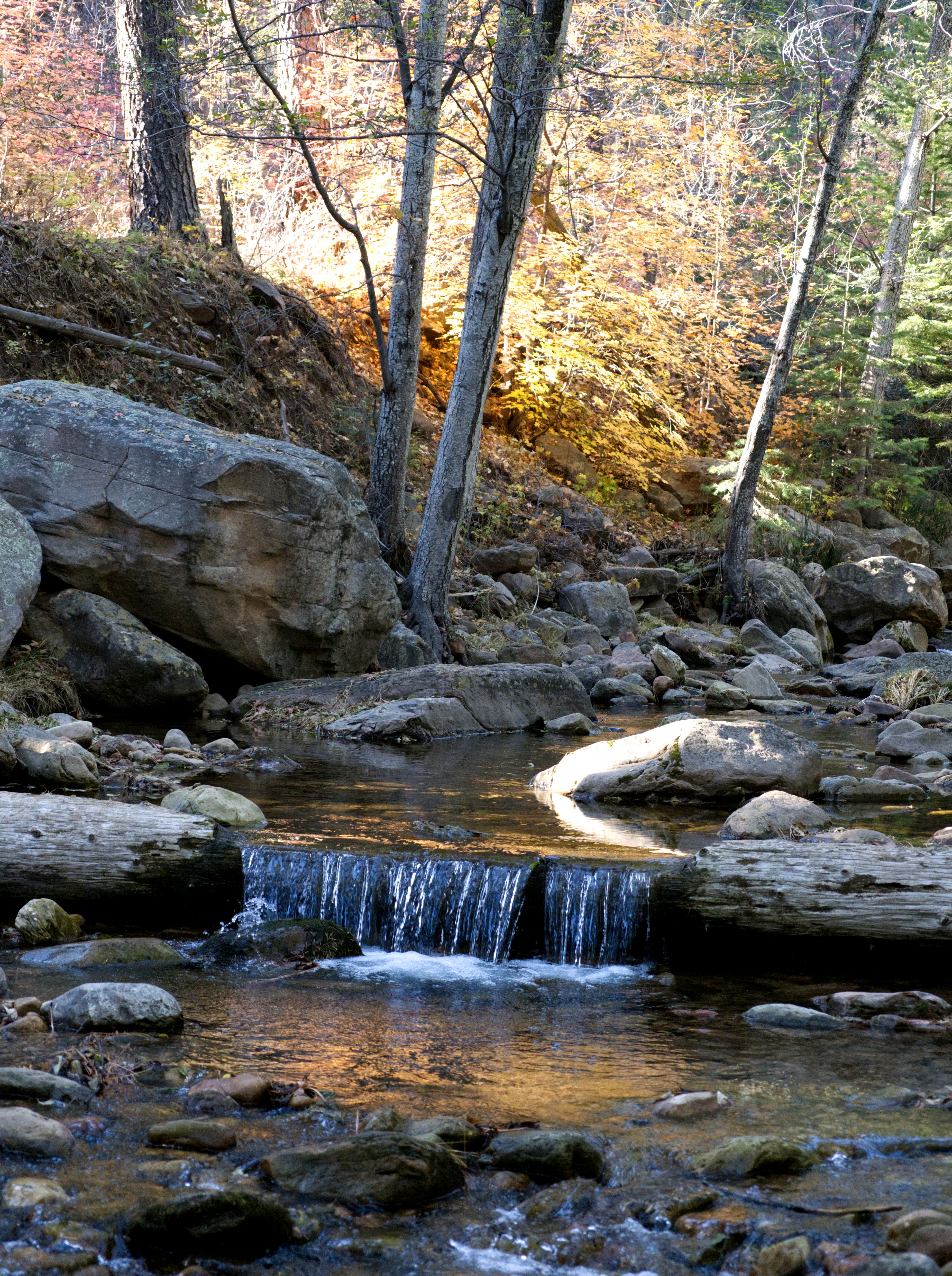 Waterfall over a log in the late afternoon sun