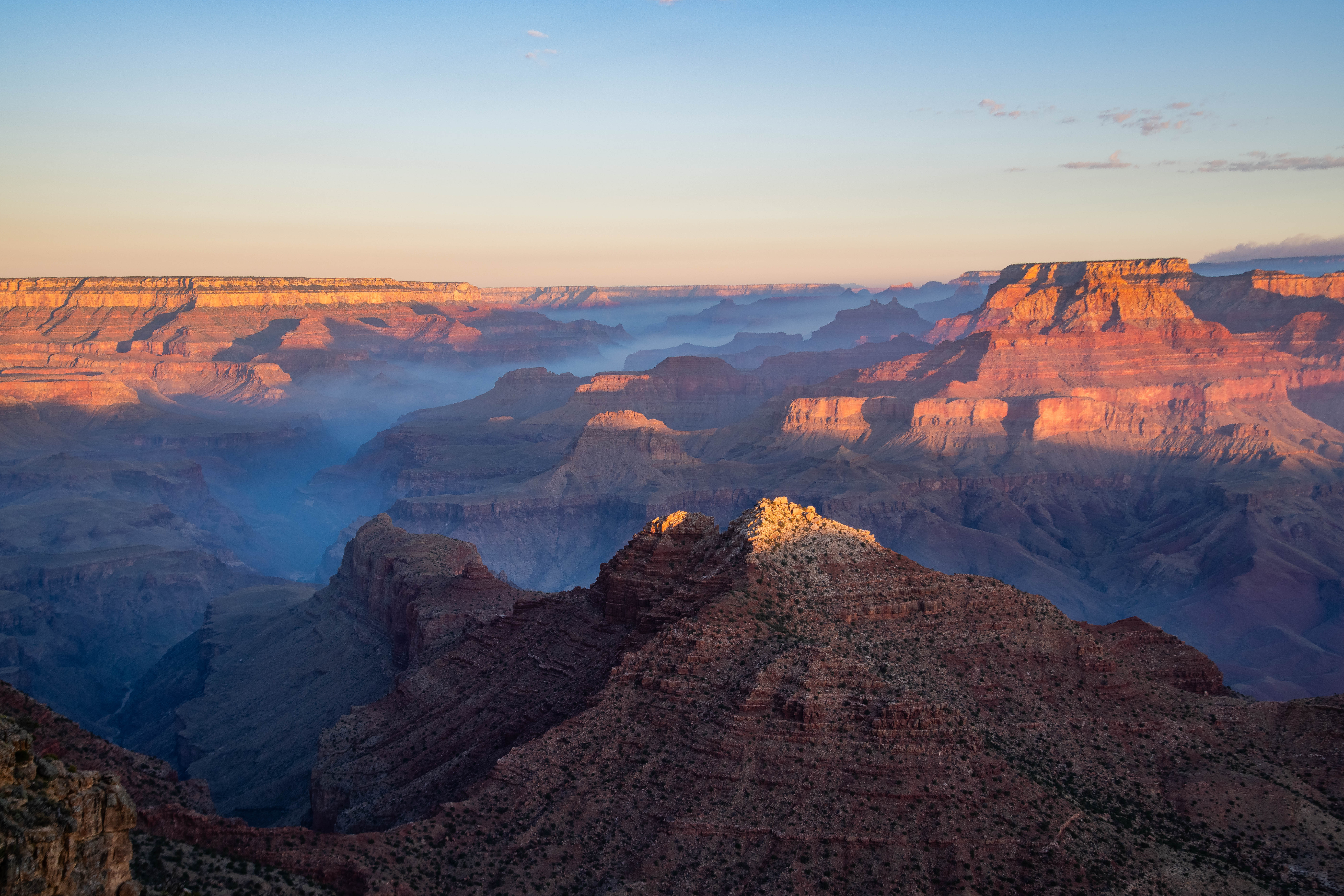 Smoke from the Dragon Bravo fire sinks to the bottom of the Grand Canyon over night, and here the first rays of sunrise illuminate the rocks.