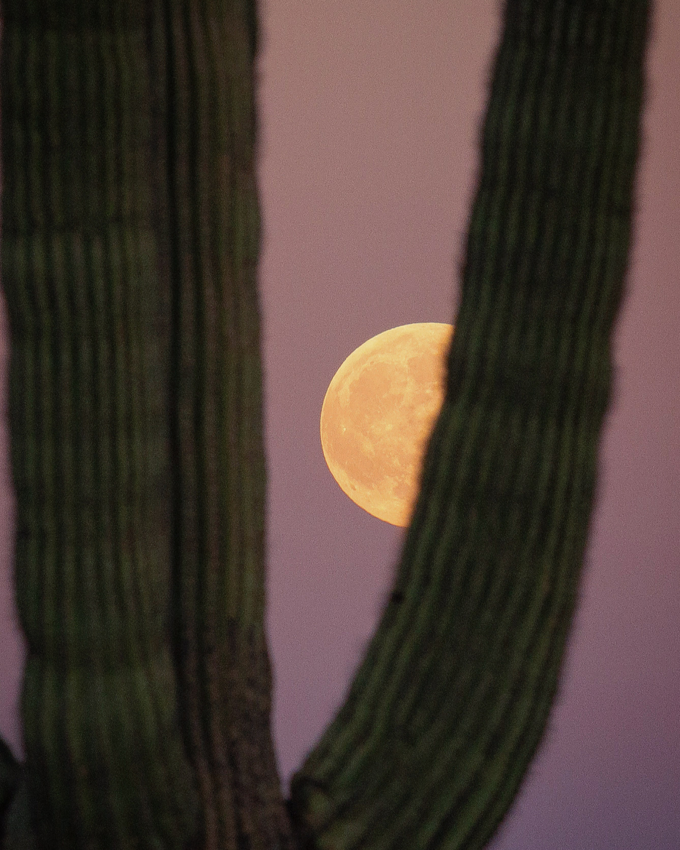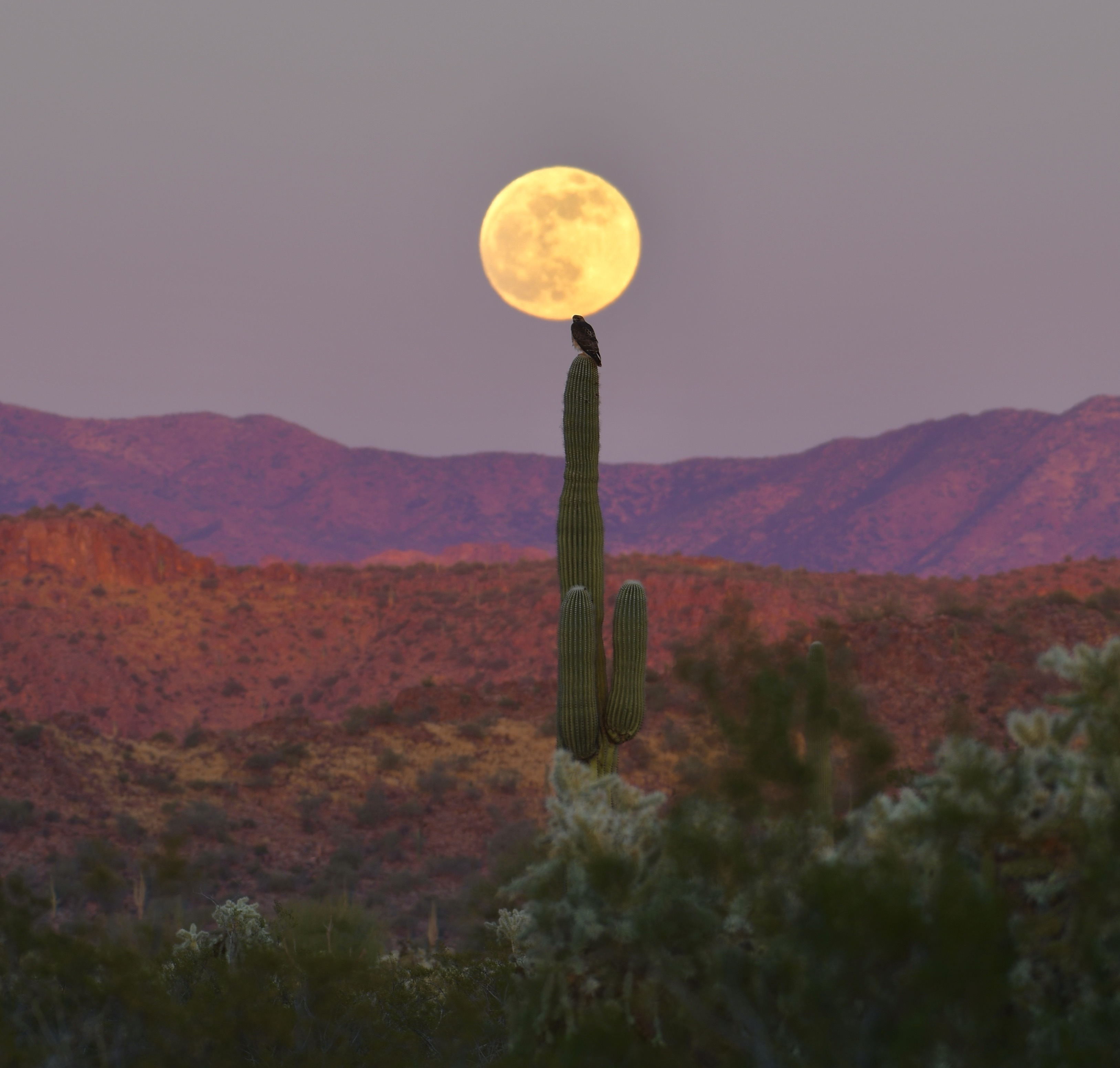 A red-tailed hawk witnesses the rise of the winter solstice supermoon over the Superstition Wilderness.