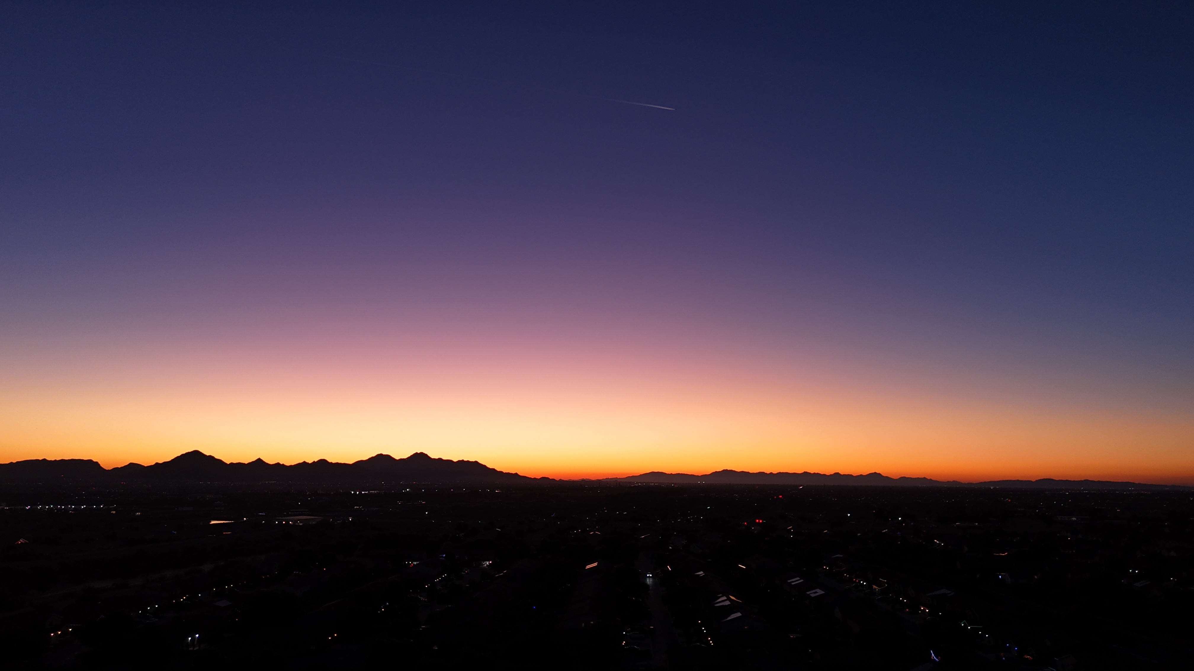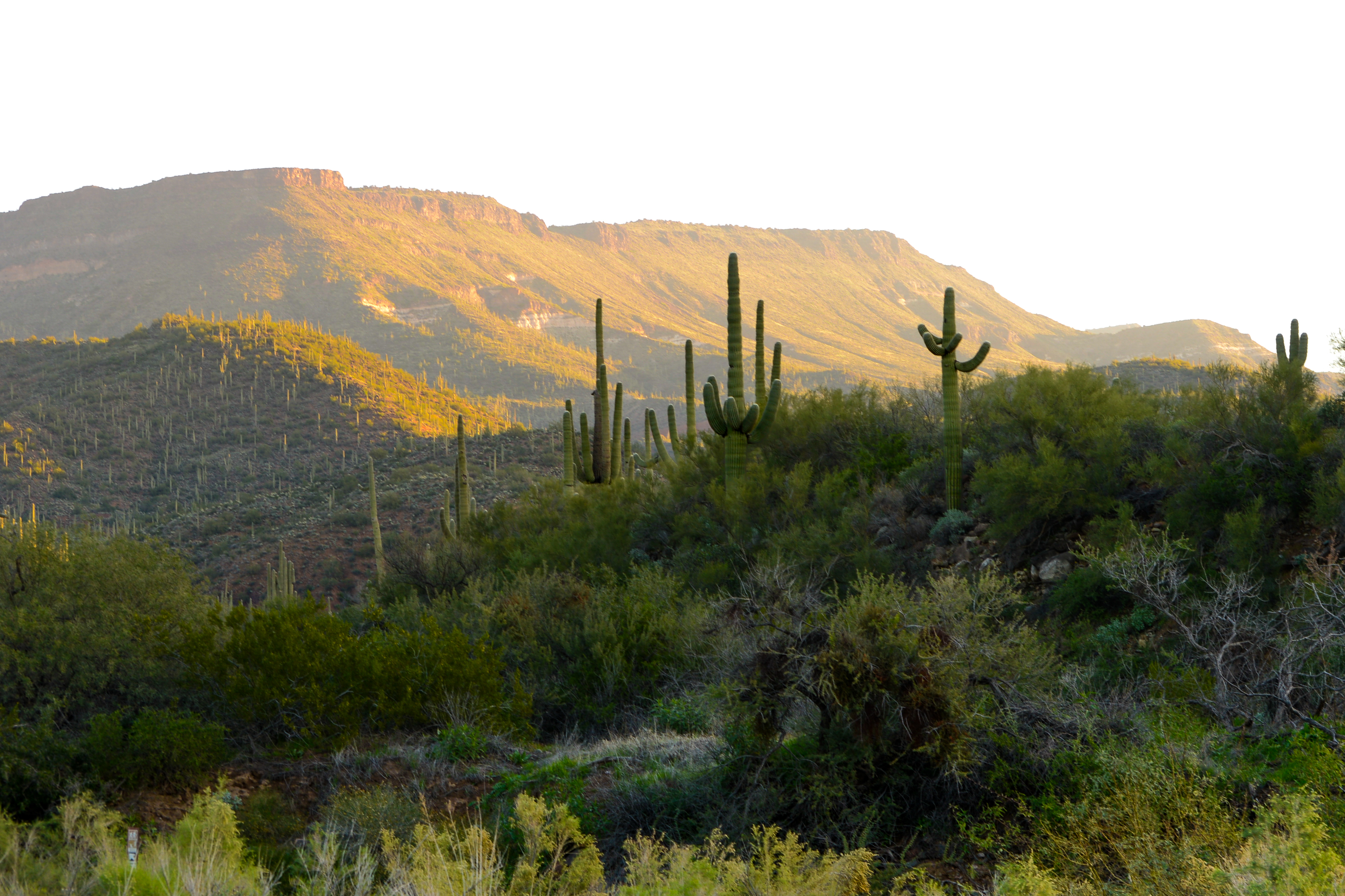 A November sunrise casts a warm glow across the mountains dotted with saguaros at Spur Cross Ranch Conservation Area.
