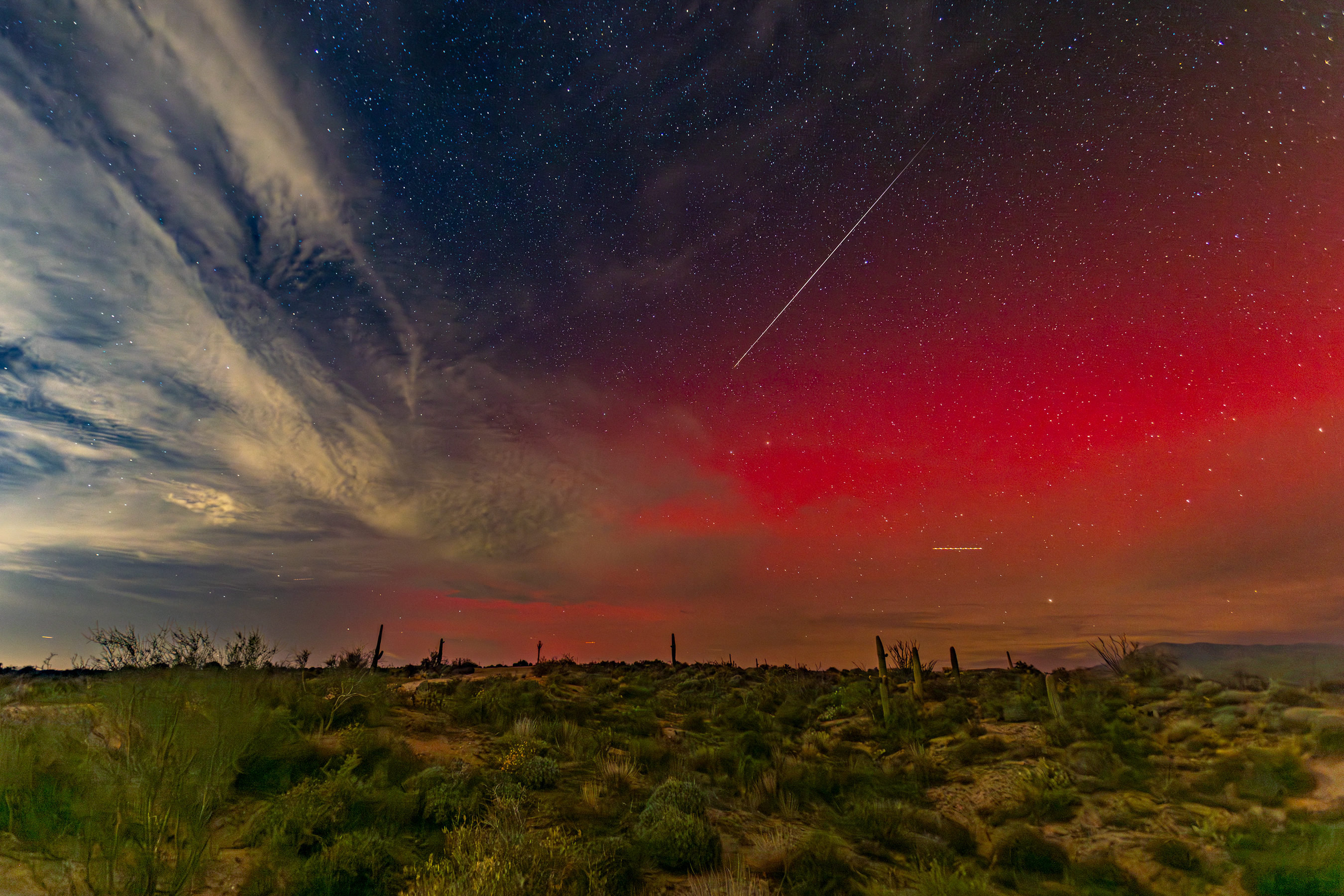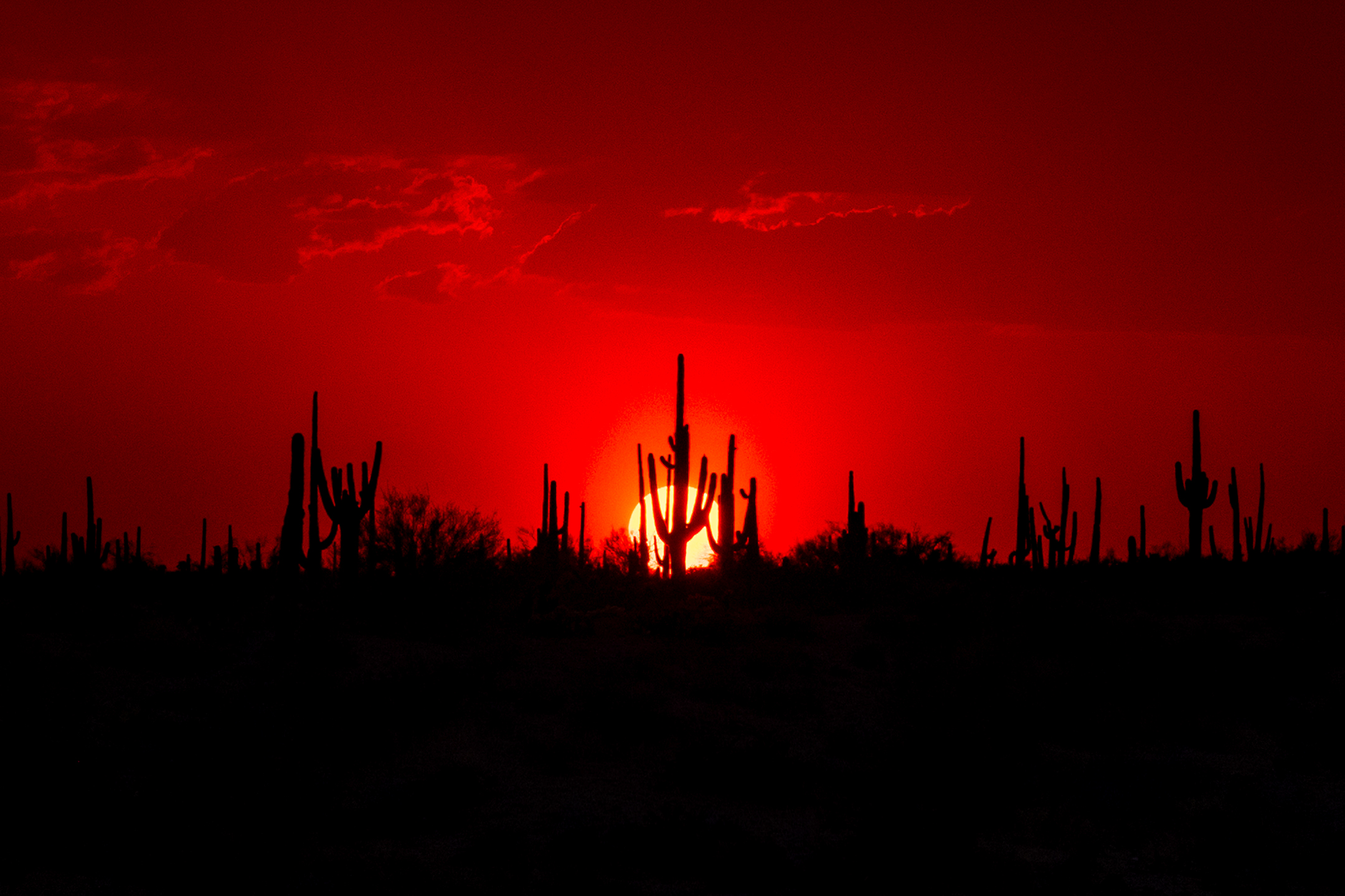 The combination of smoke from a wildfire being blown in with a haboob from a thunderstorm created an intensely red sunset behind saguaros.