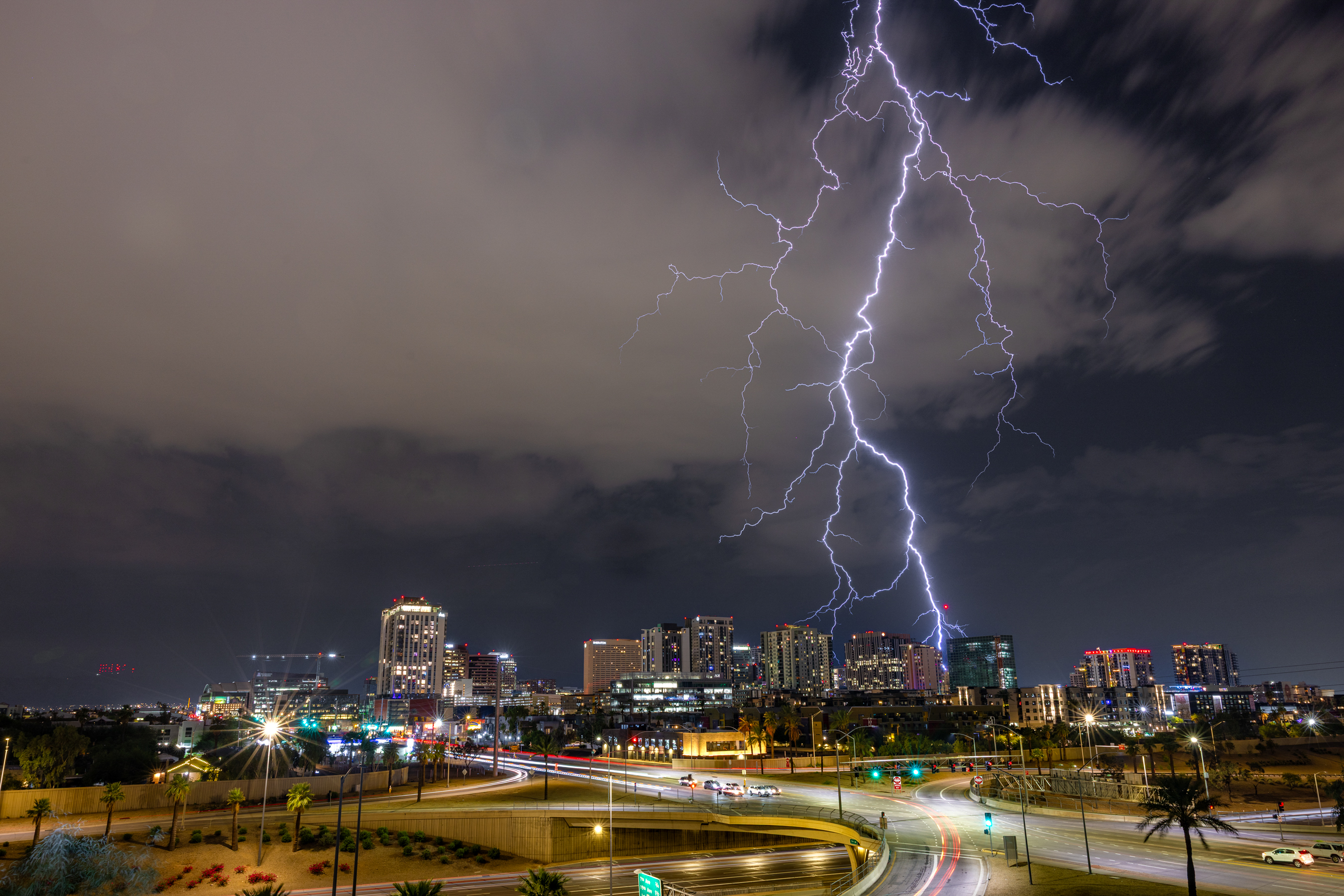A massive bolt of lightning strikes downtown Phoenix during one of the last monsoon storms of 2025.