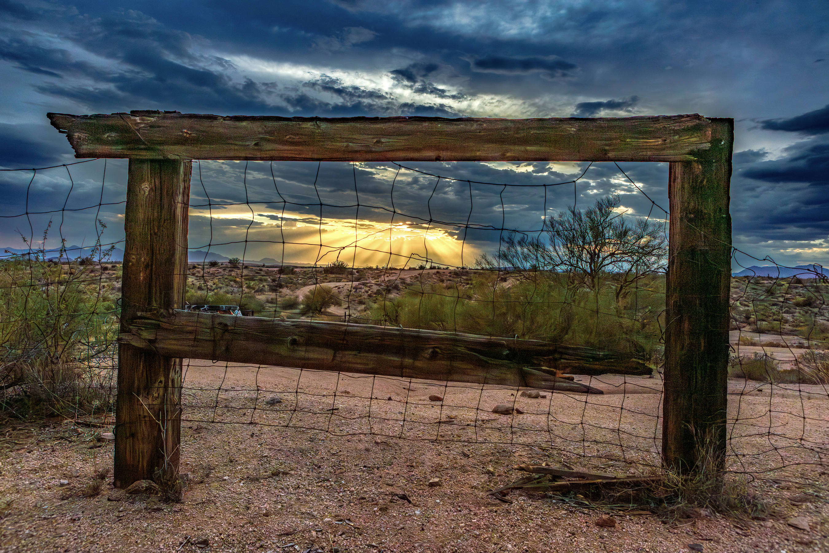 A fanned out sunset seen through the remains of an old corral near Four Peaks.