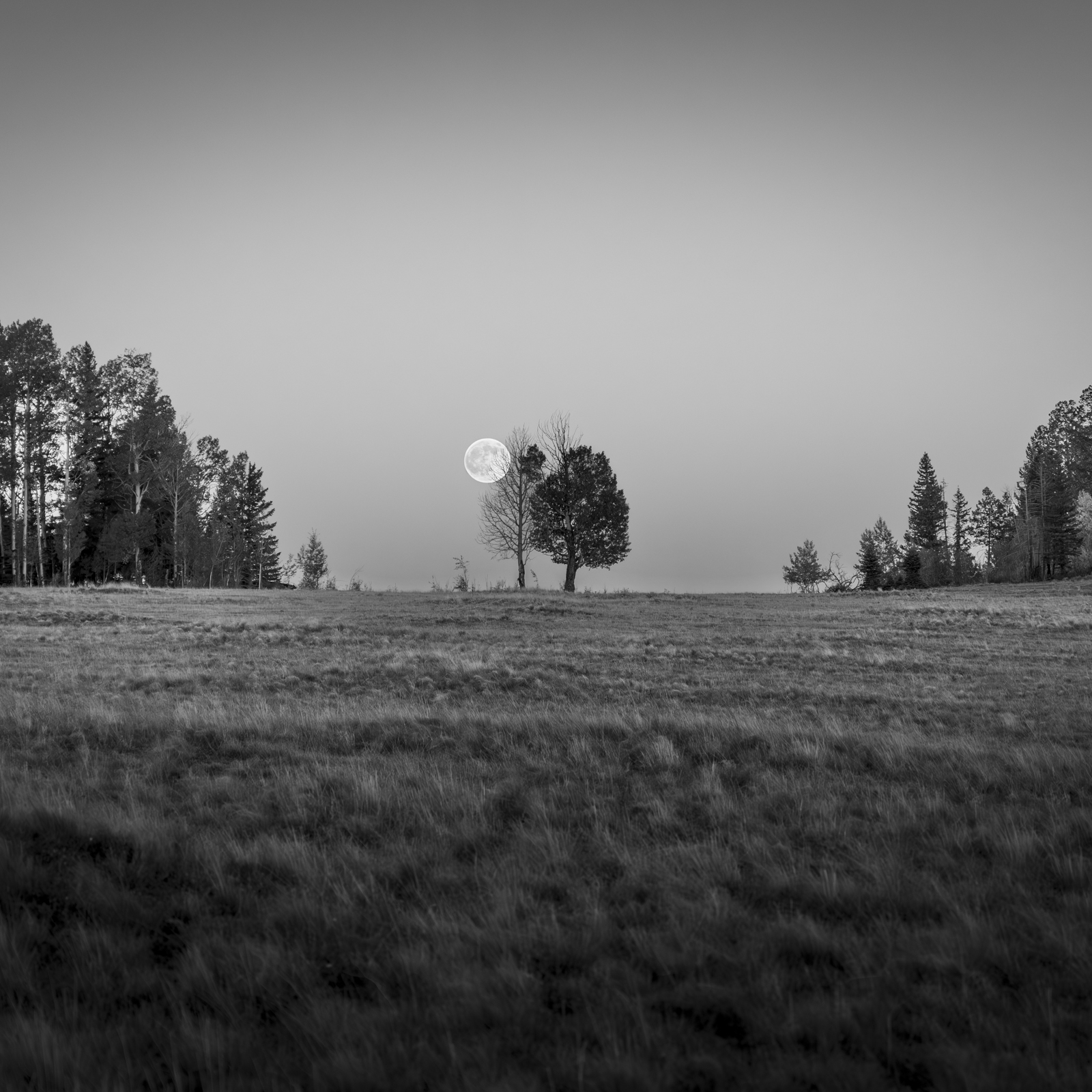 A wider view of the harvest moon rising over two aspen trees in the White Mountains.