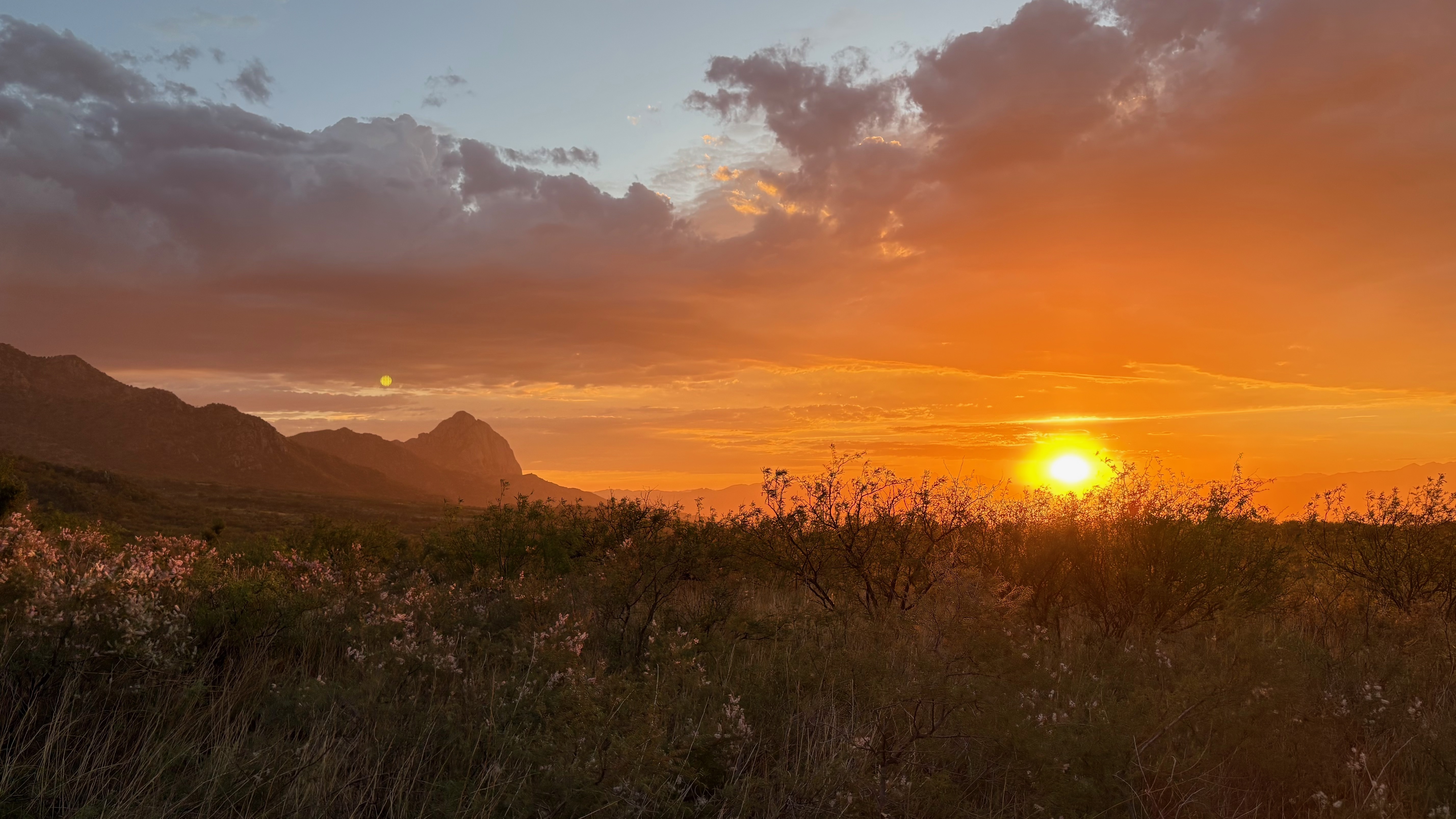 A brilliant sunset glow reflecting off of the clouds and the Santa Rita Mountains, near Green Valley at the base of Madera Canyon. A dust storm rolling though created the perfect viewing conditions.