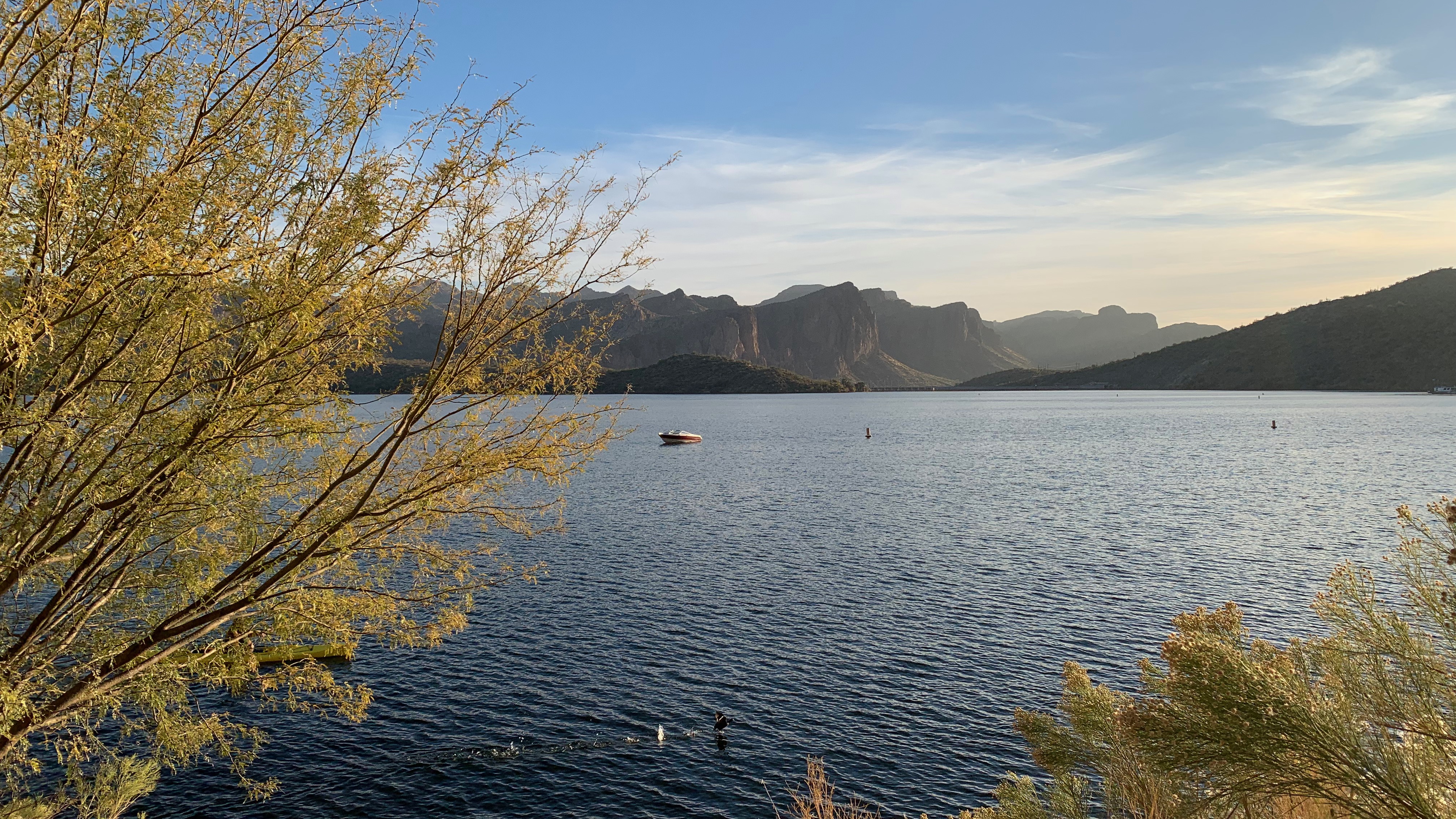 Scene of Saguaro Lake with a boat, a kayak, and a duck landing. It was a dusty day in the Phoenix area which made the ridgelines surrounding the lake have an interesting and mysterious look to them.