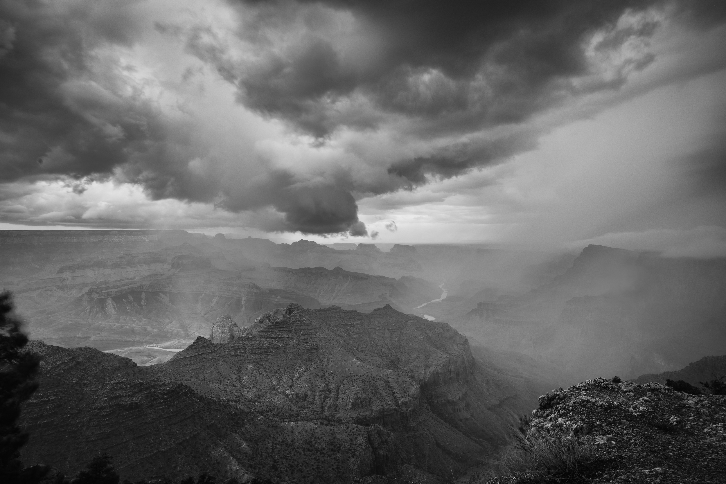 Violent thunderstorms brought clouds, rain, and dust into the Grand Canyon on this evening.