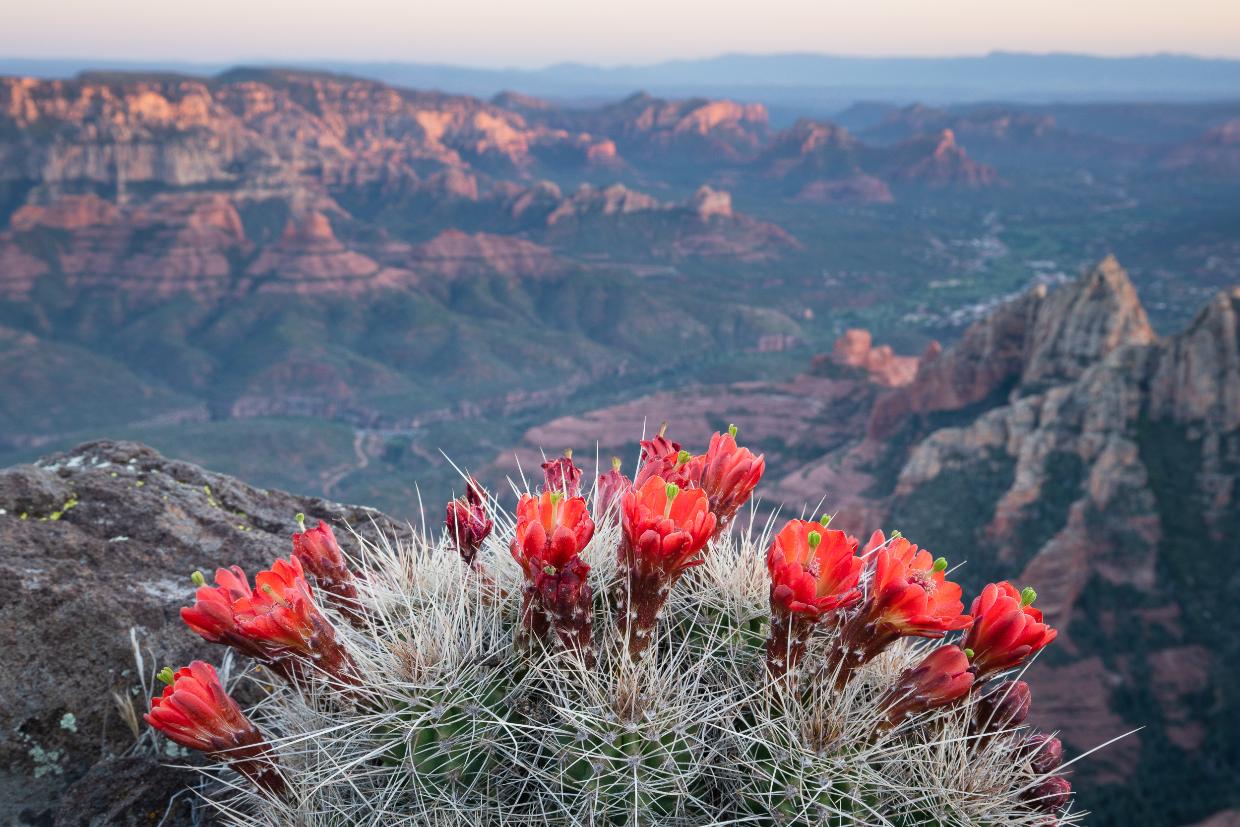 Flowering Hedgehog Cactus overlooking Sedona from the top of Wilson Mountain. Evening.