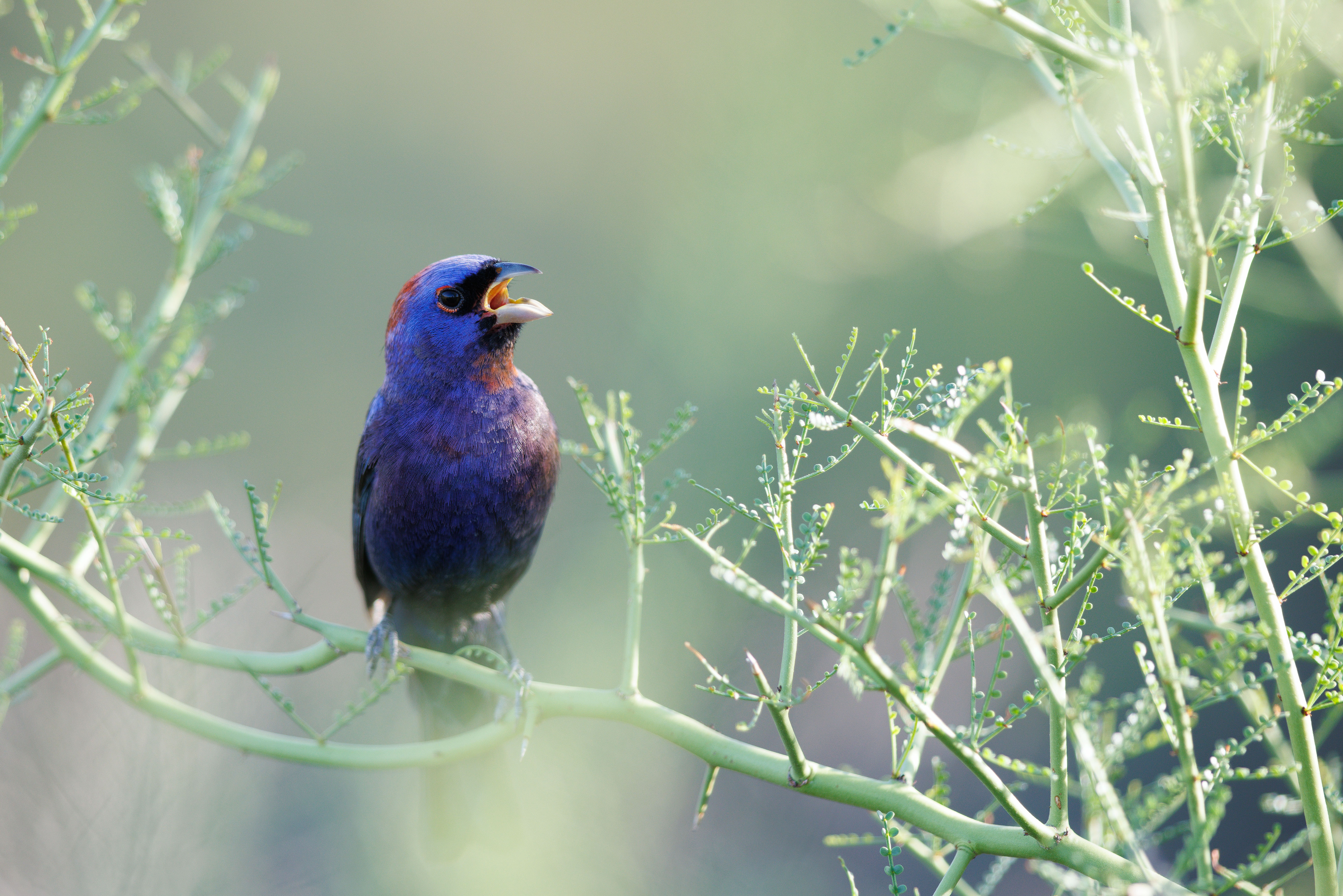 Varied Bunting sings in a Foothill Palo Verde in the Arizona-Sonora Desert Museum parking lot. This species nests on museum grounds every summer.