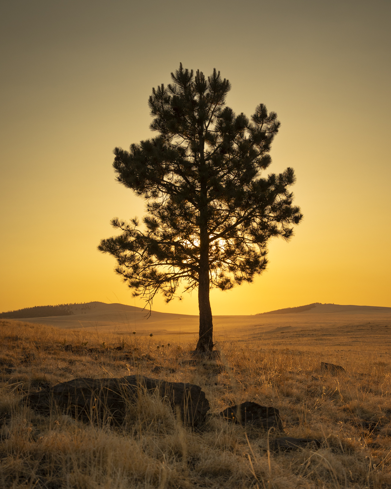 A wildfire-colored sunrise silhouettes this young pine tree in orange morning light.