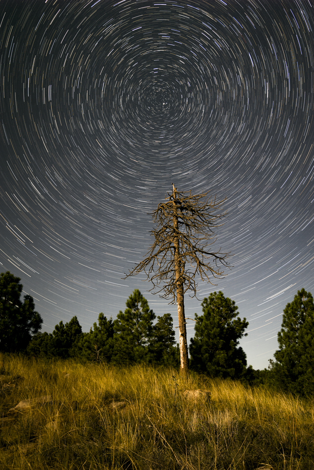 A series of images shows the star trail over a large, dead pine.