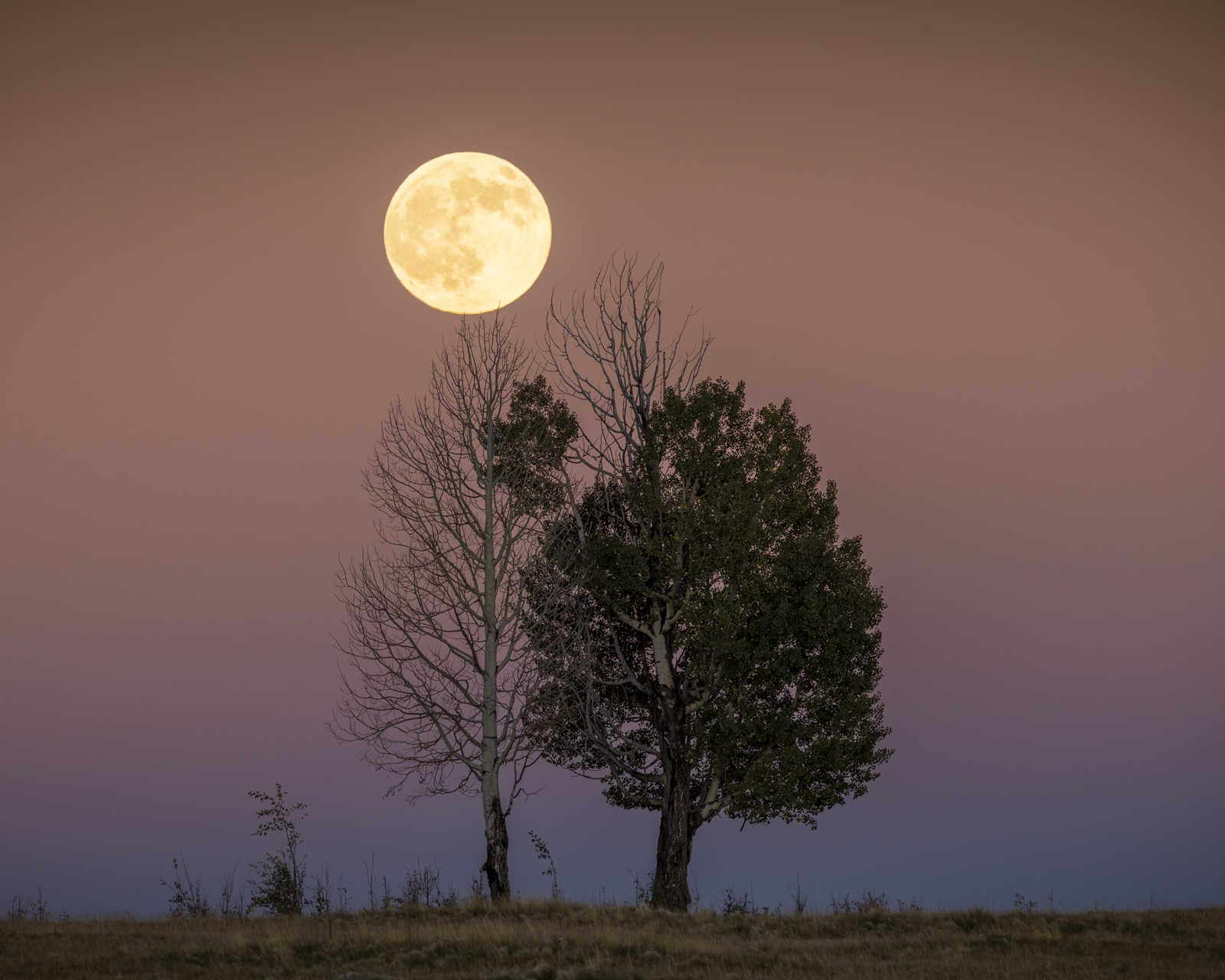 Life and Death - the rising harvest moon looks down on these two aspen trees.
