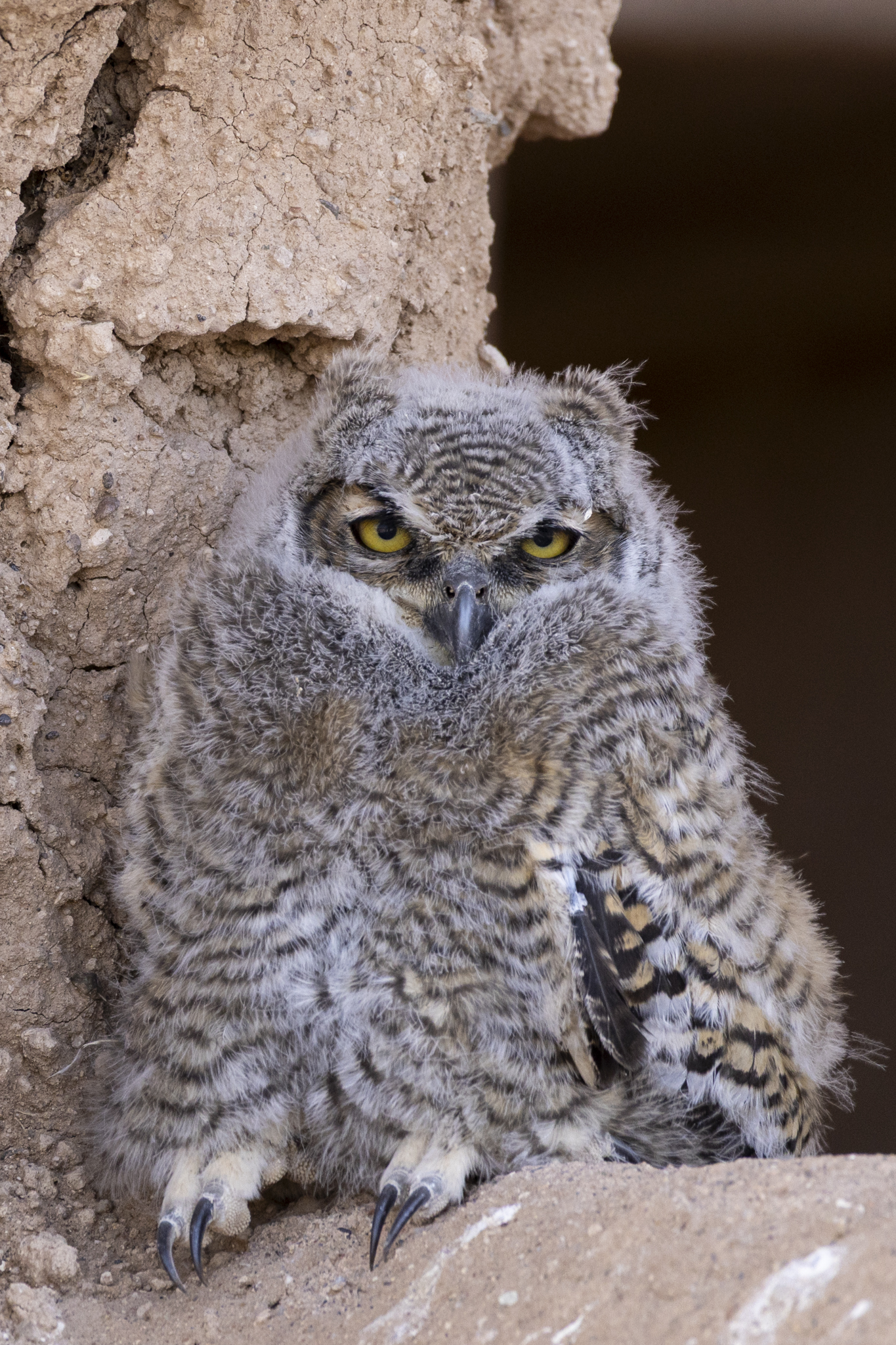 Great Horned Owlet watching visitors from its perch on the side of the Big House at Casa Grande Ruins National Monument.